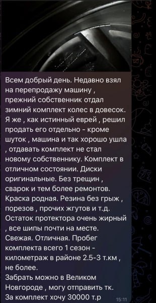 Неизвестный расписал, что недавно продал автомобиль, но комплект покрышек, который откатал лишь один сезон, новому владельцу авто не передал и готов продать за символическую цену.