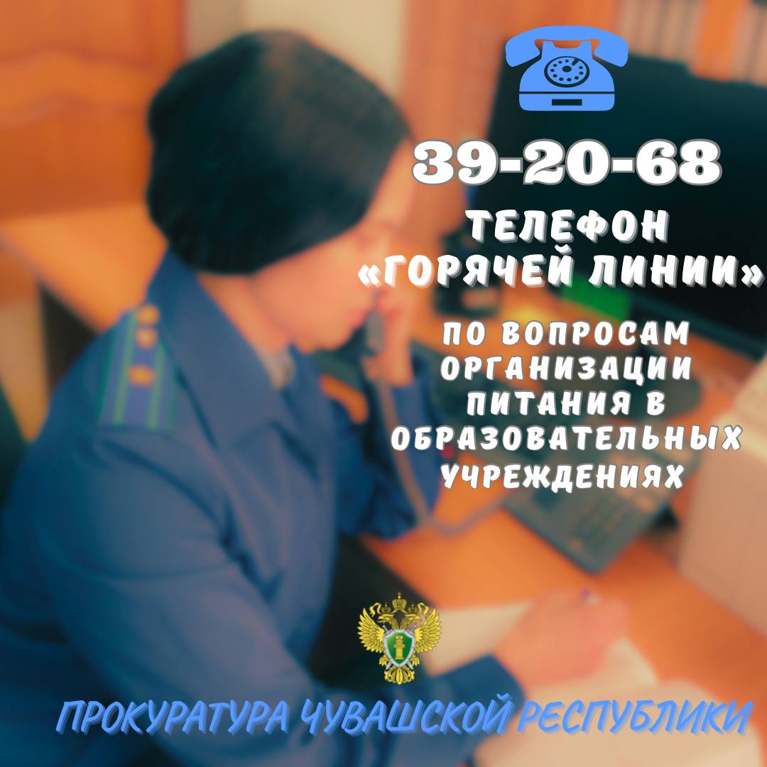 В прокуратуре Чувашии с 10 по 14 ноября будет работать «Горячая линия», по которой жители республики могут сообщить о нарушениях при организации питания обучающихся в образовательных организациях, в том числе о фактах некачественного питания, сборов денежных средств при организации «бесплатного» питания в школах и иных злоупотреблениях со стороны юридических лиц и индивидуальных предпринимателей, занимающихся организацией горячего питания детей или поставкой продуктов питания.