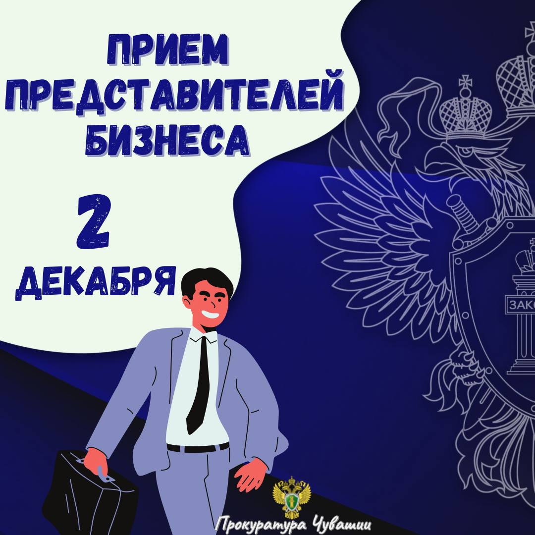 2 декабря (вторник)прокурор Чувашской Республики Эдуард Гиматов совместно с Уполномоченным по защите прав предпринимателей Александром Рыбаковым проведет личный прием предпринимателей региона.