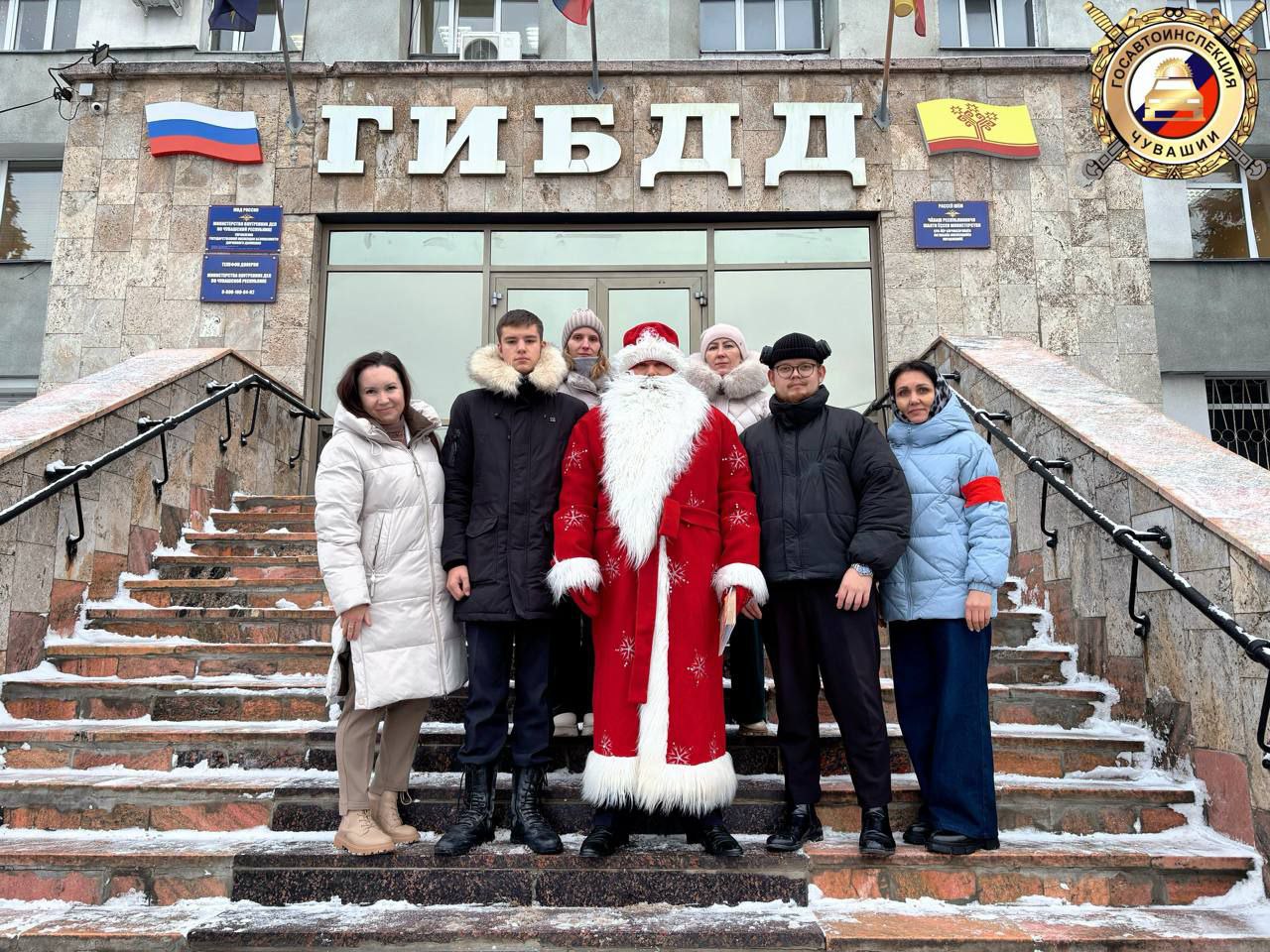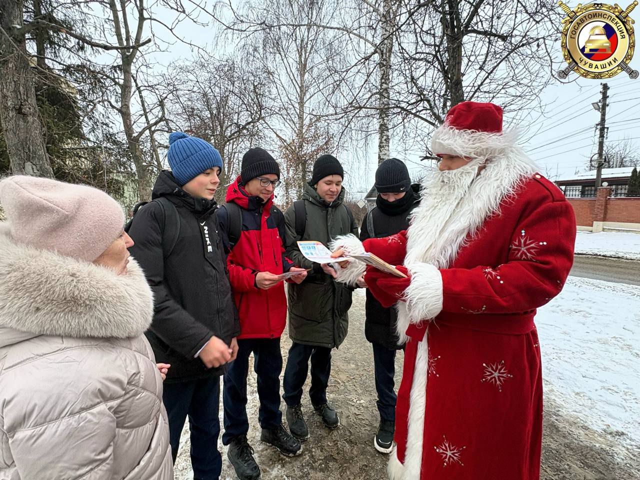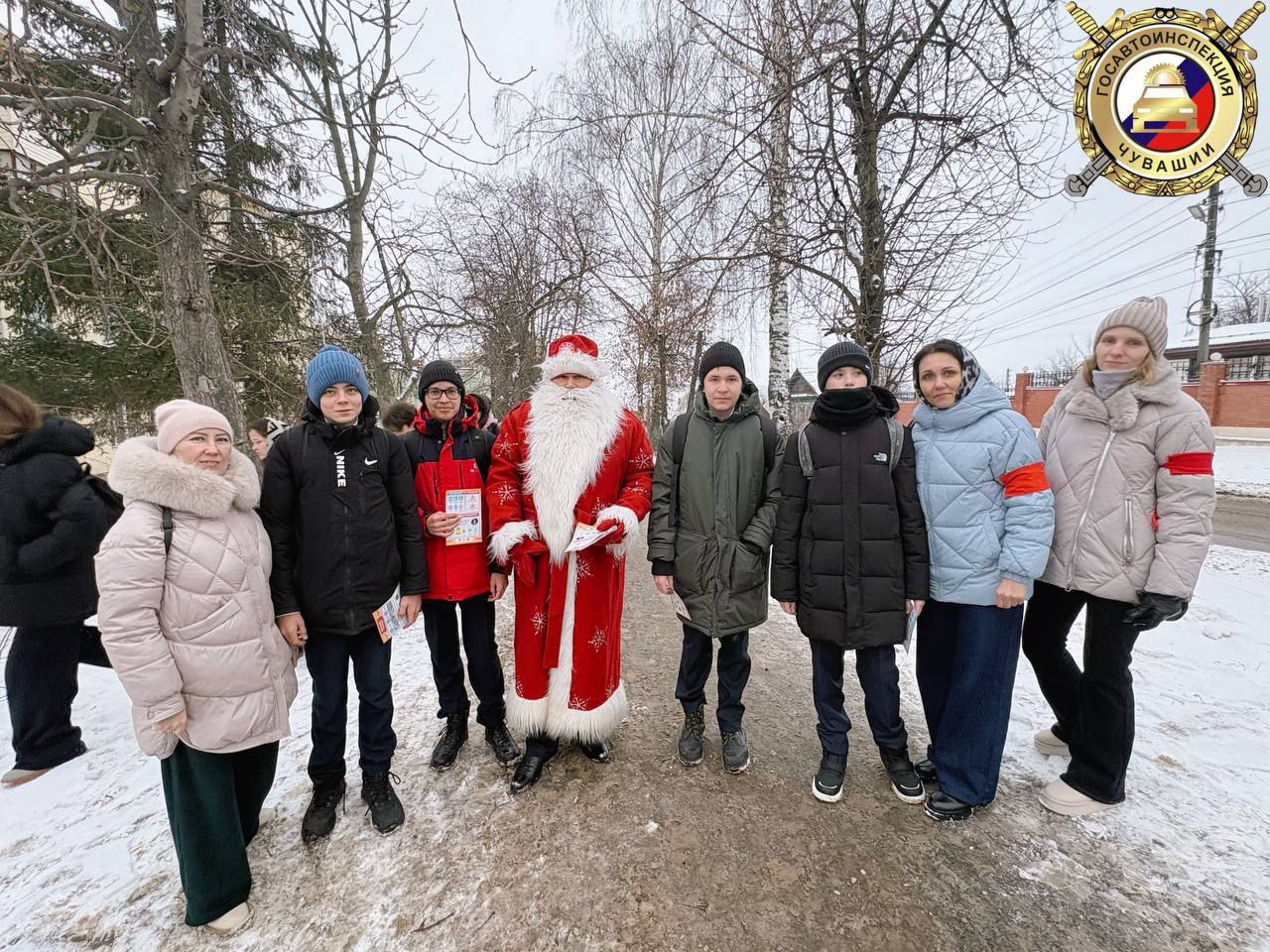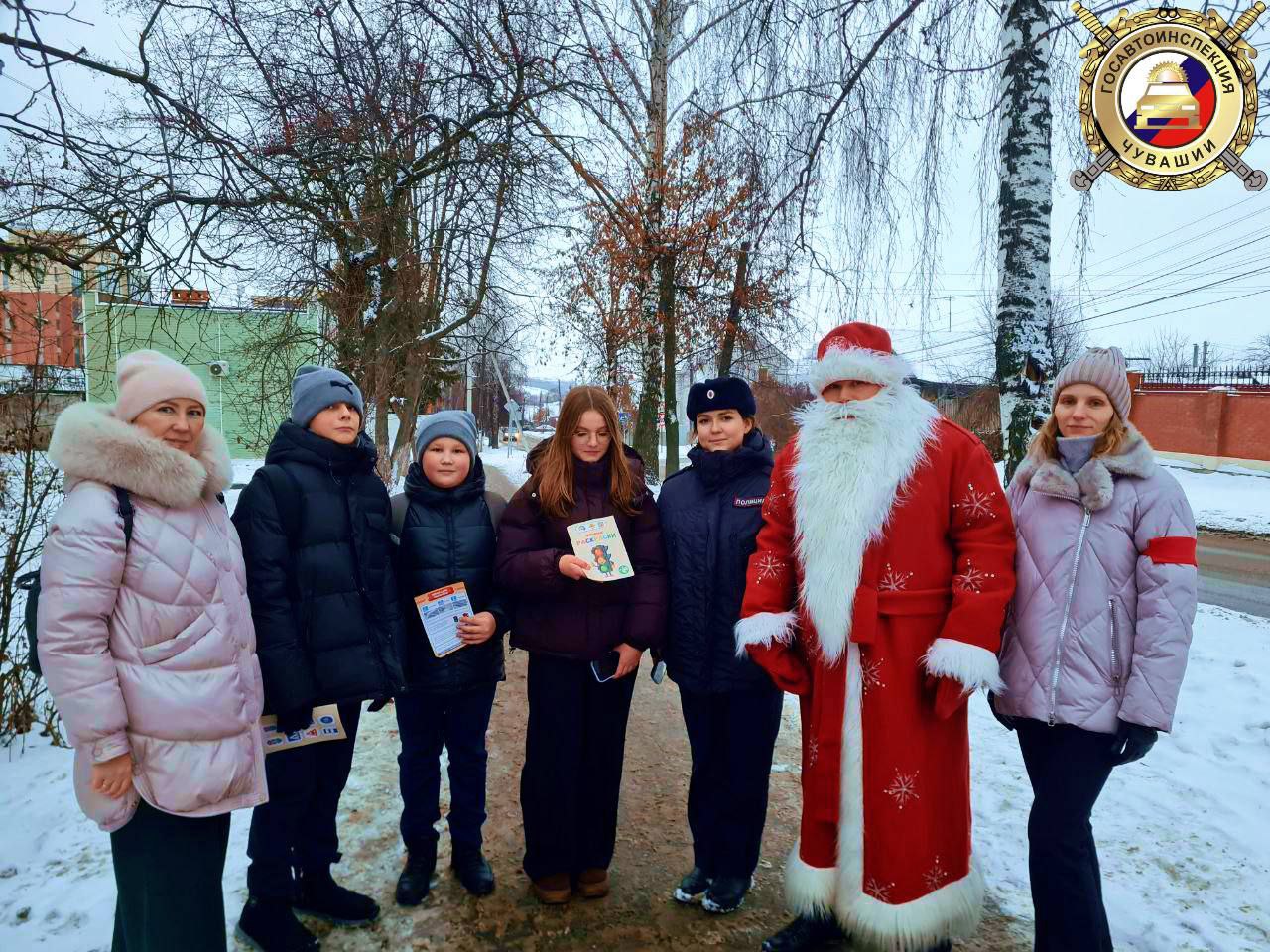 Полицейский Дед Мороз в составе родительского патруля напомнил чебоксарским школьникам о Правилах дорожного движения.