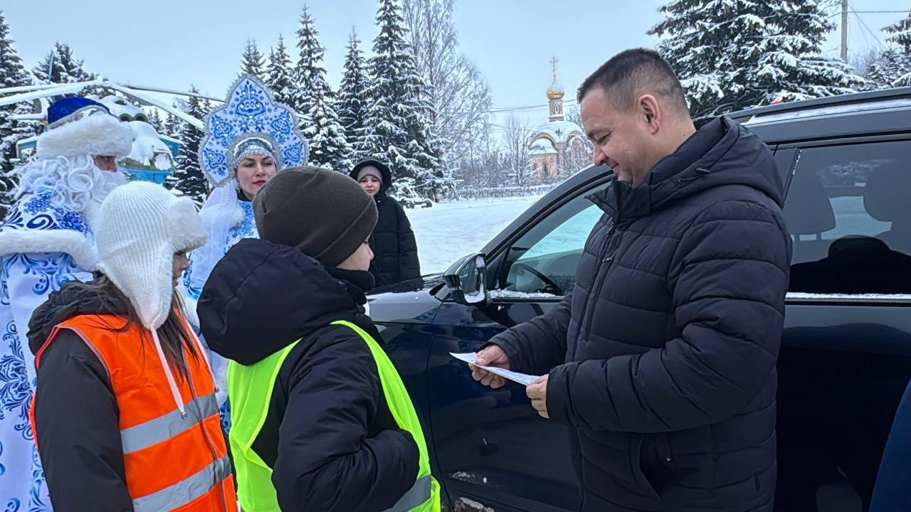 К водителям вышли не инспекторы ДПС с проверкой, а Дед Мороз, Снегурочка и их помощники – юидовцы канашской средней школы № 3.