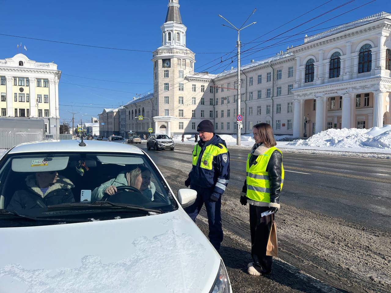 6 марта в Чебоксарах на Площади Республики дежурил праздничный патруль, состоящий из сотрудников Госавтоинспекции, представителей Общественного совета при УМВД России по городу Чебоксары и популярного новостного портала.