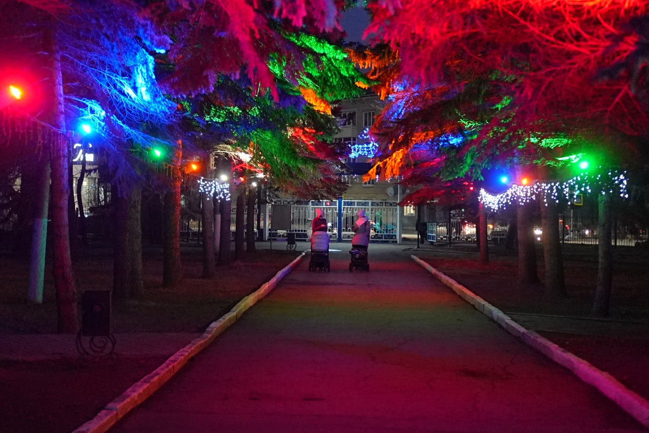 Помимо праздничной программы новогоднее настроение создаст и оформление парка. Деревья здесь заиграли яркими цветными огнями, а центральная аллея утопает в гирляндах, создавая атмосферу настоящей зимней сказки.