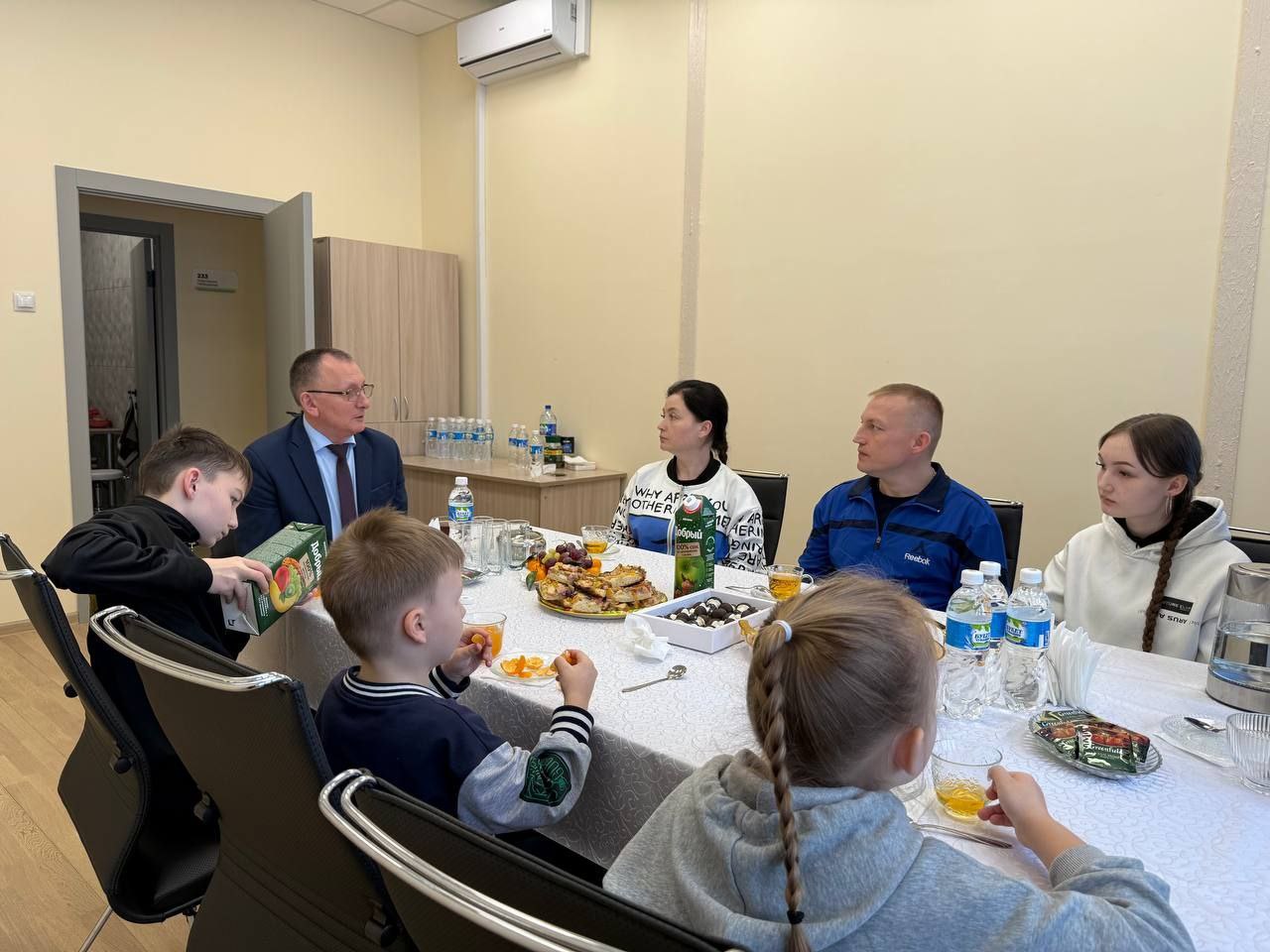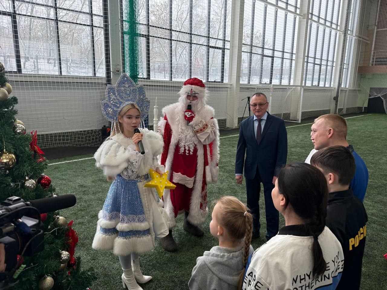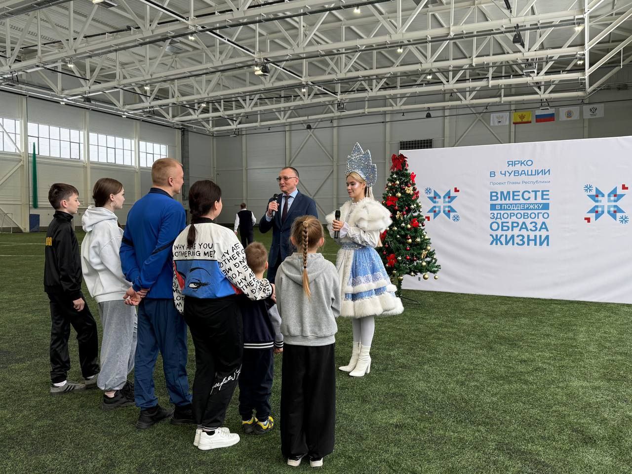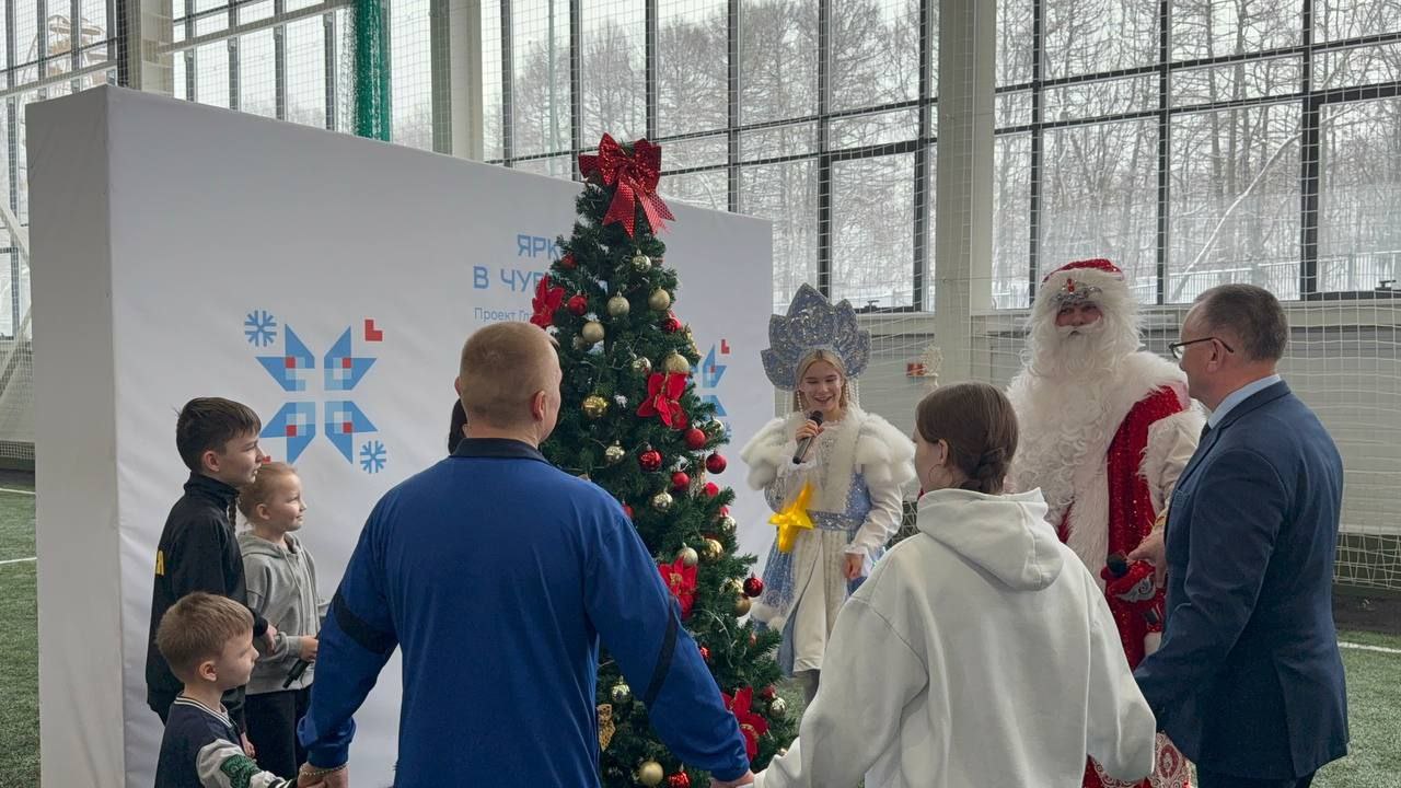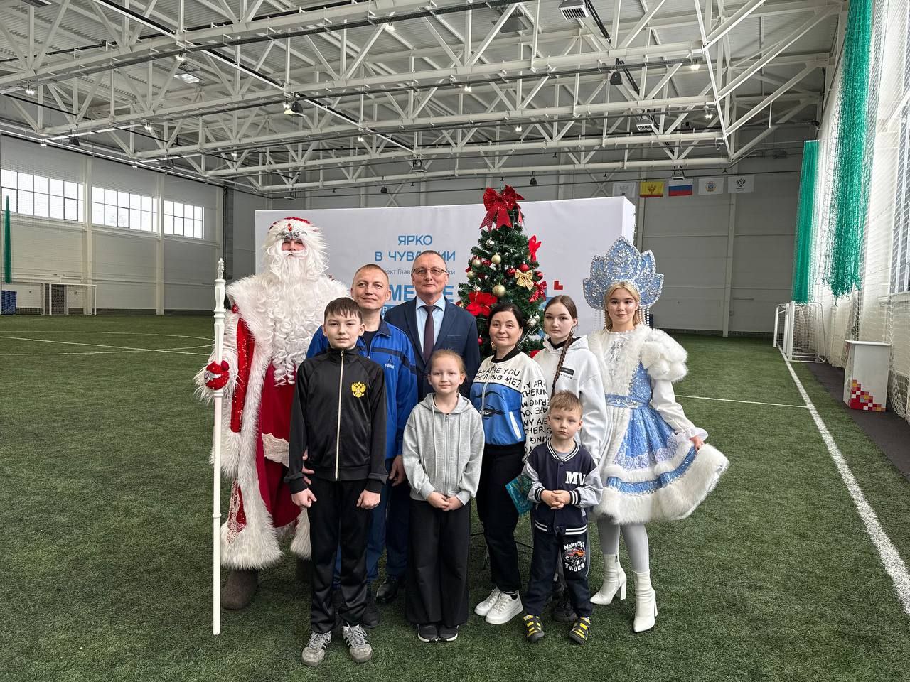 В чебоксарском футбольном манеже в рамках акции «Ёлка желаний» министр спорта Чувашии Василий Петров вручил подарки детям из семьи Медведевых.