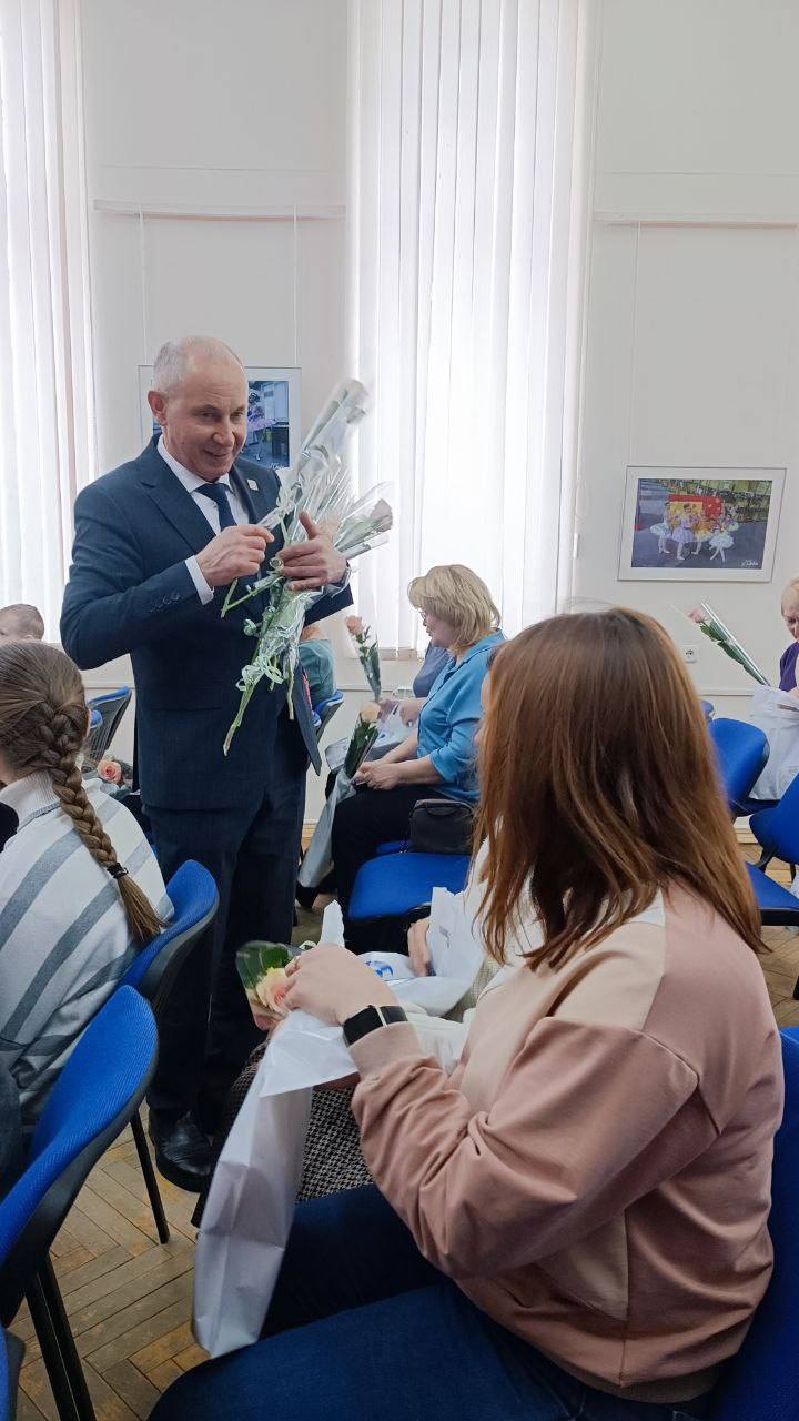 Александр Николаевич и Ольга Петрова поздравили прекрасный пол с наступающим праздником весны, вручили цветы и подарки.
