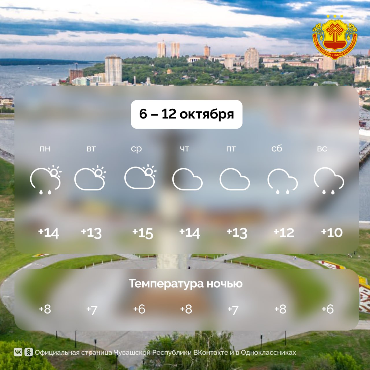 По прогнозам синоптиков, на этой неделе в Чебоксарах дневная температура будет колебаться от +10 до +15 °C, ночная — от +6 до +8 °C.