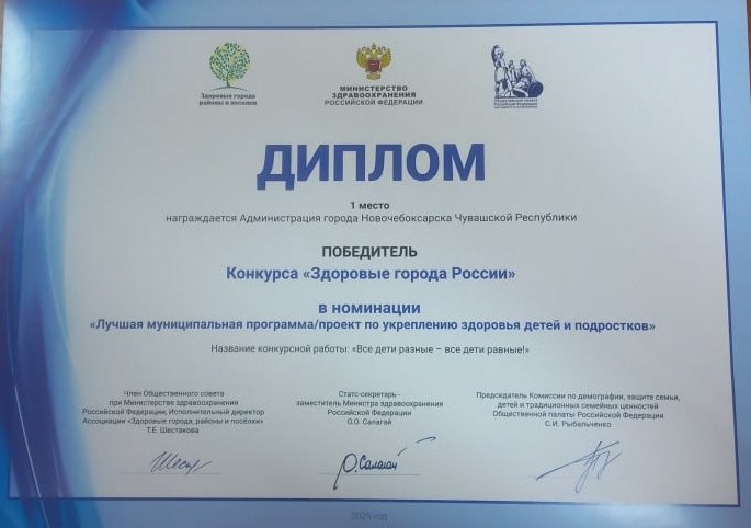 В номинации «Лучшая муниципальная программа/ проект по укреплению здоровья детей и подростков» администрация города Новочебоксарска Чувашской Республики заняла 1 место с проектом «Все дети разные – все дети равные!».