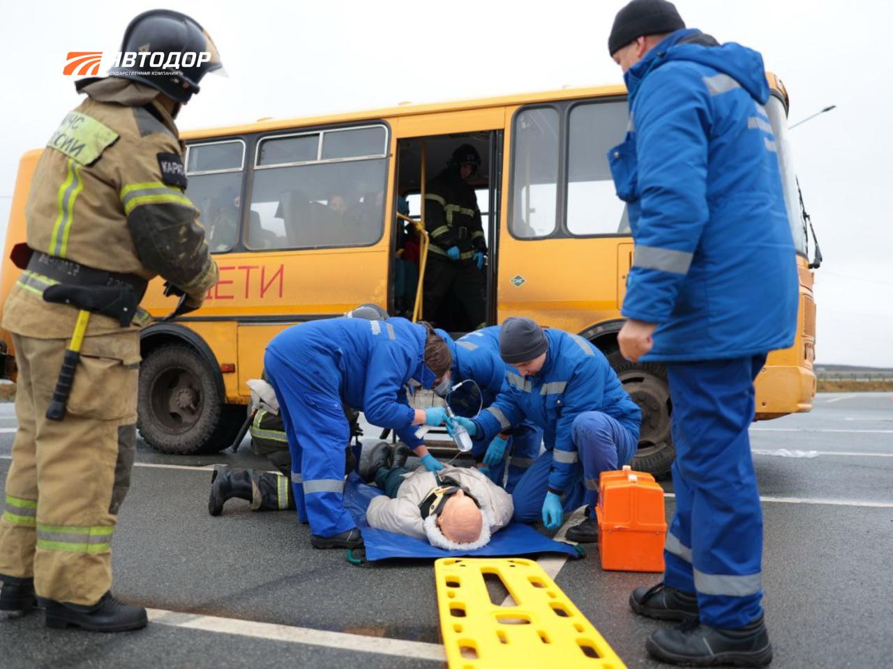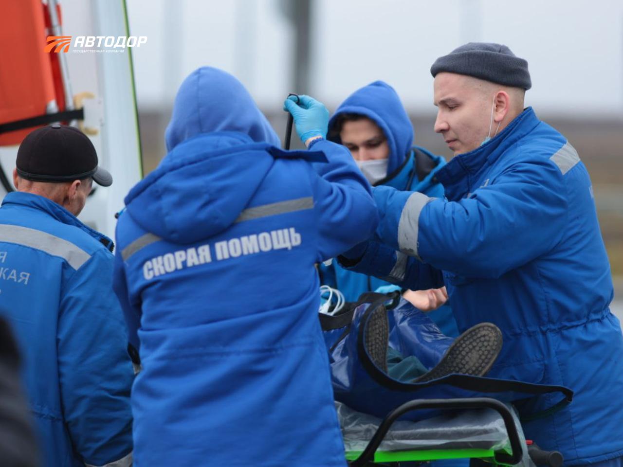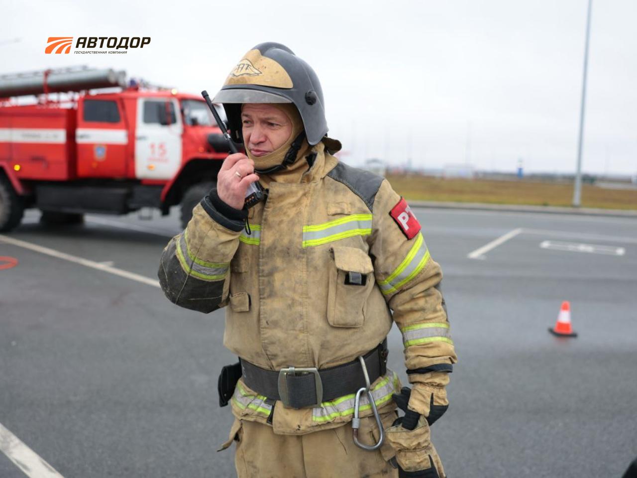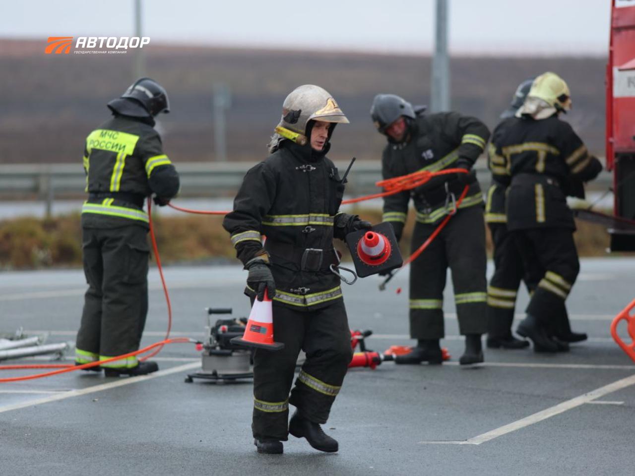 На скоростной трассе специалисты «Автодора», МЧС, ГИБДД и медики отработали действия при массовом ДТП (по легенде в аварии было 15 пострадавших).