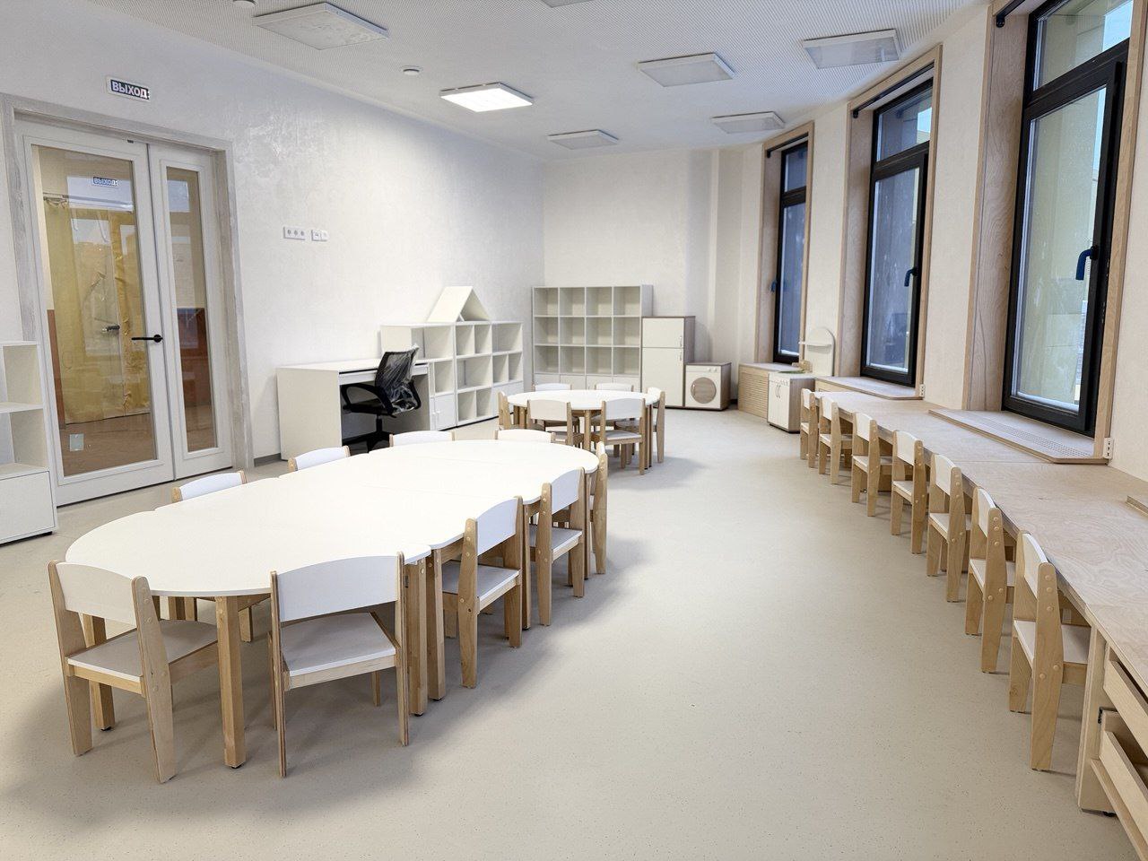 Лаконичный интерьер пространств детского сада оформлен в светлых тонах, воспитанников ждут занятия в сенсорной комнате, кулинарной мастерской.