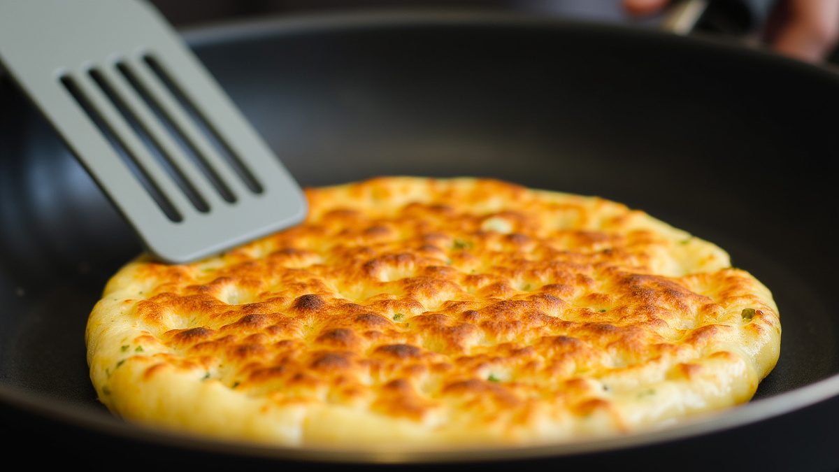 На заранее разогретую антипригарную сковороду, слегка смазанную растительным маслом, выкладывается часть теста, которая равномерно распределяется по поверхности. Лепешка обжаривается по 20 секунд с каждой стороны до золотистой корочки, придавая ей такую аппетитную форму.