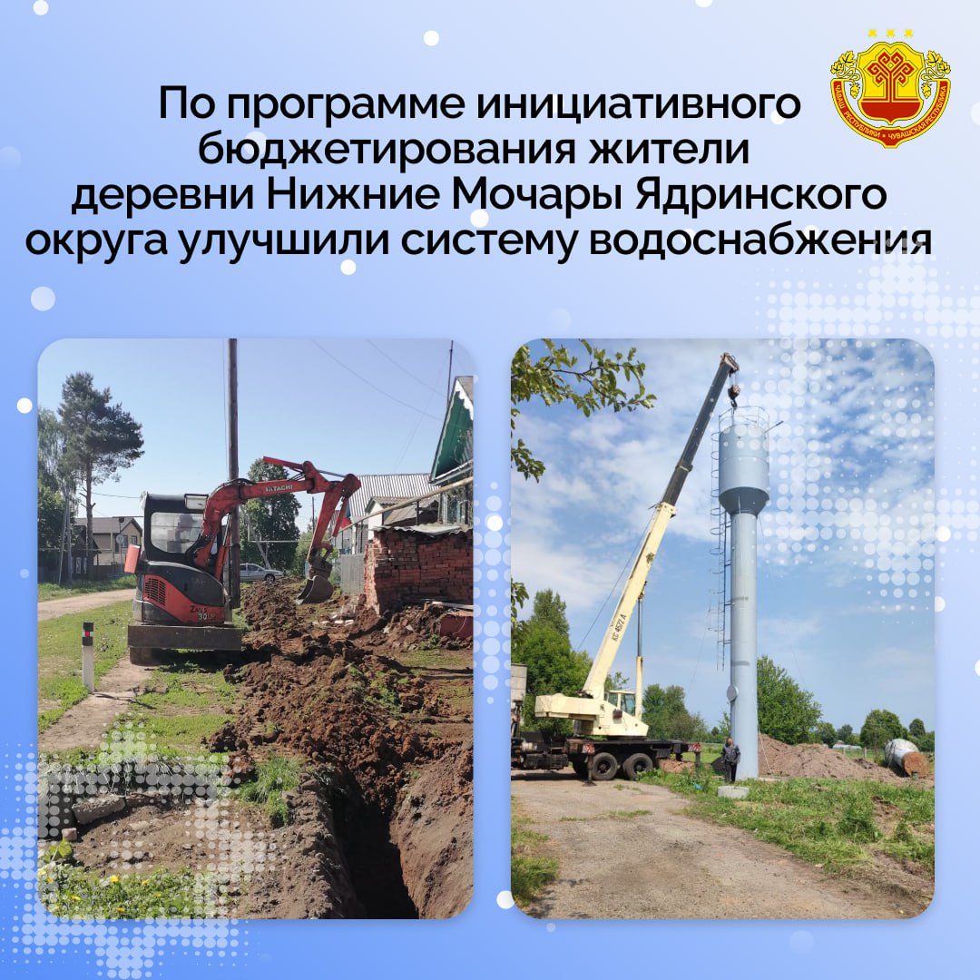 По инициативе местных жителей в деревне Нижние Мочары Ядринского округа заменили водонапорную башню и обновили систему автоматики по улице Советская. Проект финансировали из республиканского и местного бюджетов, а также за счет внебюджетных средств. Общая сумма составила 1,9 млн рублей.