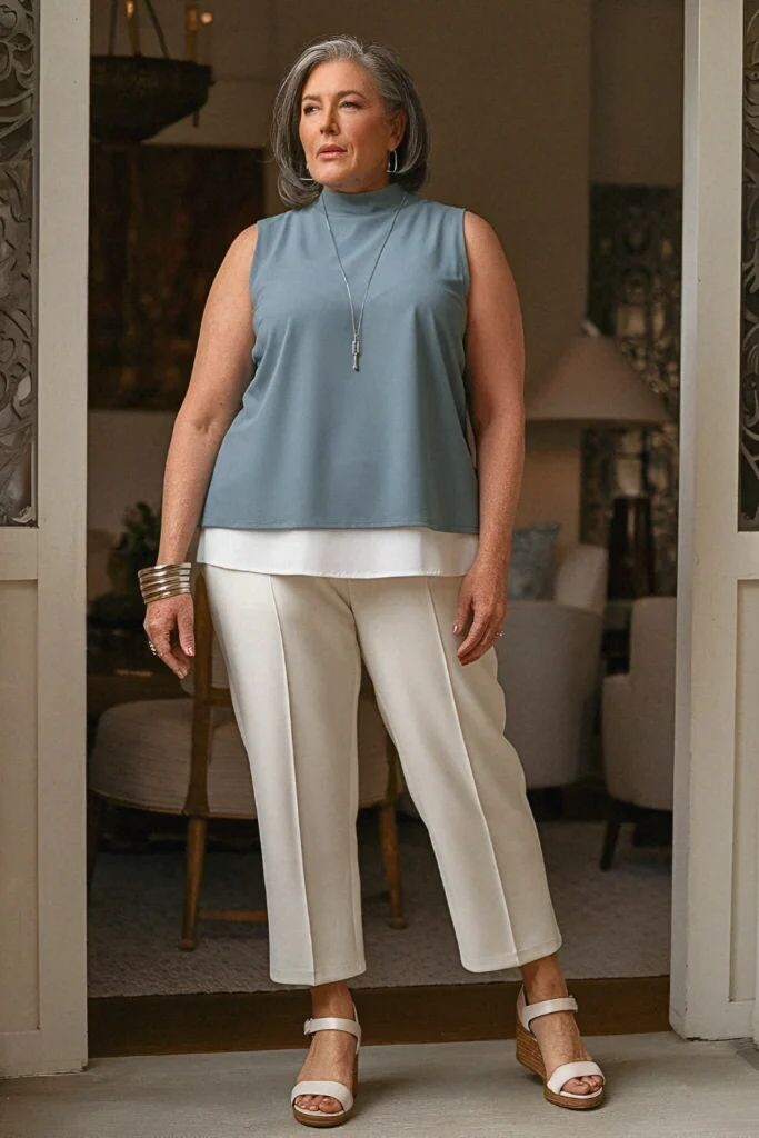 - Темные брюки палаццо: помогут скрыть недостатки, идеально сочетаясь с яркими верхами. Например, льняная блузка светло-зеленого цвета в сочетании с укороченным белым кардиганом создаст стильный лук. Бежевые босоножки добавят элегантности.