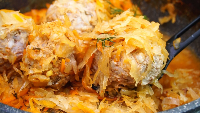 В это время стоит заняться квашеной капустой. Если она очень кислая, рекомендуется промыть её в горячей воде, чтобы убрать излишнюю кислотность. На дно жаровни выкладывается половина капусты, затем формируются тефтели, которые помещаются сверху. Далее нужно добавить обжаренный на сковороде лук и накрыть оставшейся капустой.
