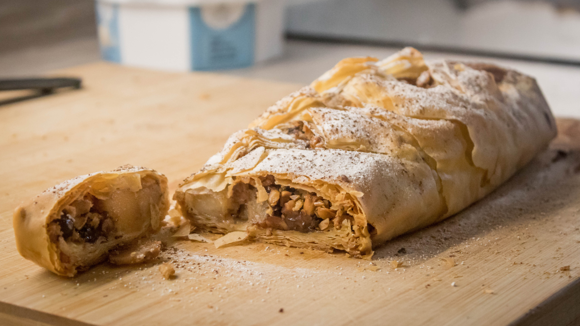 Штрудель традиционно готовят с яблоками и вишней. Считается, что именно такое сочетание наиболее гармонично: сладость удачно соотносится с тонкой кислинкой.