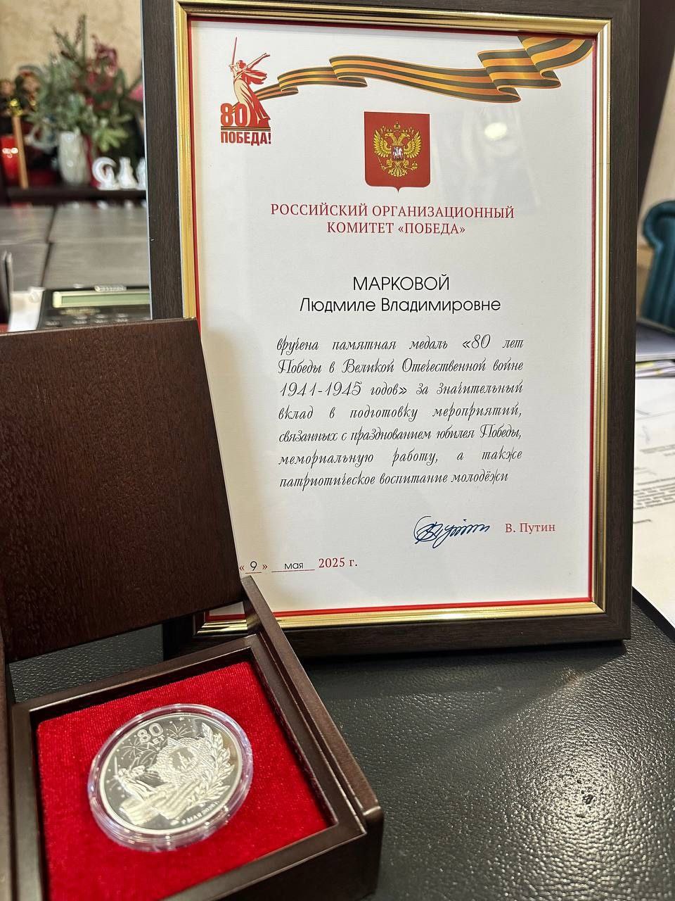 Медалью «80 лет Победы в Великой Отечественной войне 1941–1945 годов» награждена Людмила Маркова, начальник управления культуры и развития туризма.
