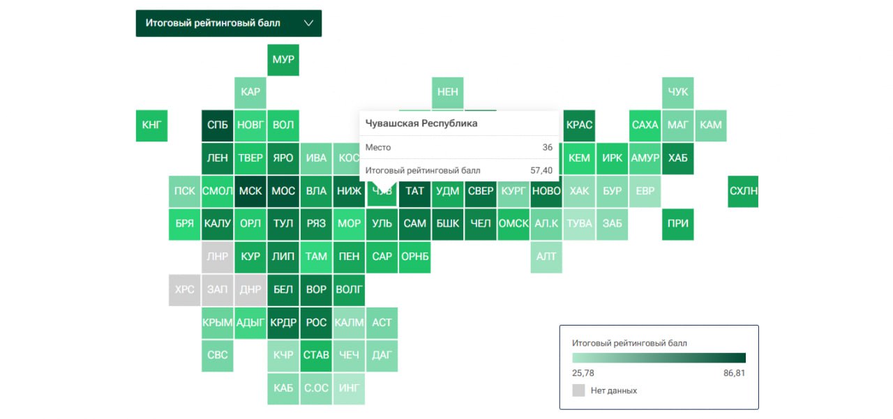 Первые три места рейтинга, как и годом ранее, занимают Москва, Санкт-Петербург и Московская область. Замыкают общий список Еврейская автономная область, Республика Тыва и Ингушетия.