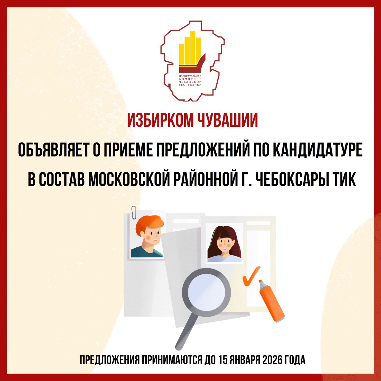Избирательная комиссия Чувашской Республики объявляет о приеме предложений по кандидатуре в состав Московской районной г. Чебоксары территориальной избирательной комиссии.