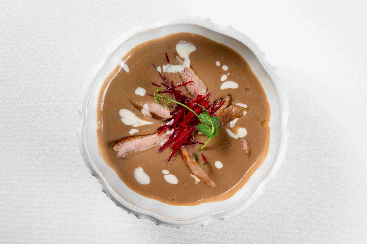 Теперь пора заняться филе перепелки. Оно нарезается на ломтики и обжаривается на сливочном масле до готовности. Готовый суп комбинируется с кусочками перепелки, а для украшения можно добавить тонкую соломку из свежей свеклы. Это не только оригинальное, но и очень аппетитное завершение блюда!