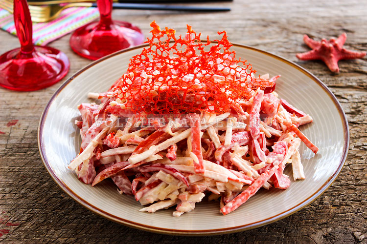 Мы предлагаем вам версию, близкую к оригиналу, однако с небольшим твистом для изысканной подачи. Для этого рекомендуем украсить салат "коралловыми" чипсами — кружевными закусками, которые вы можете найти по этой ссылке.