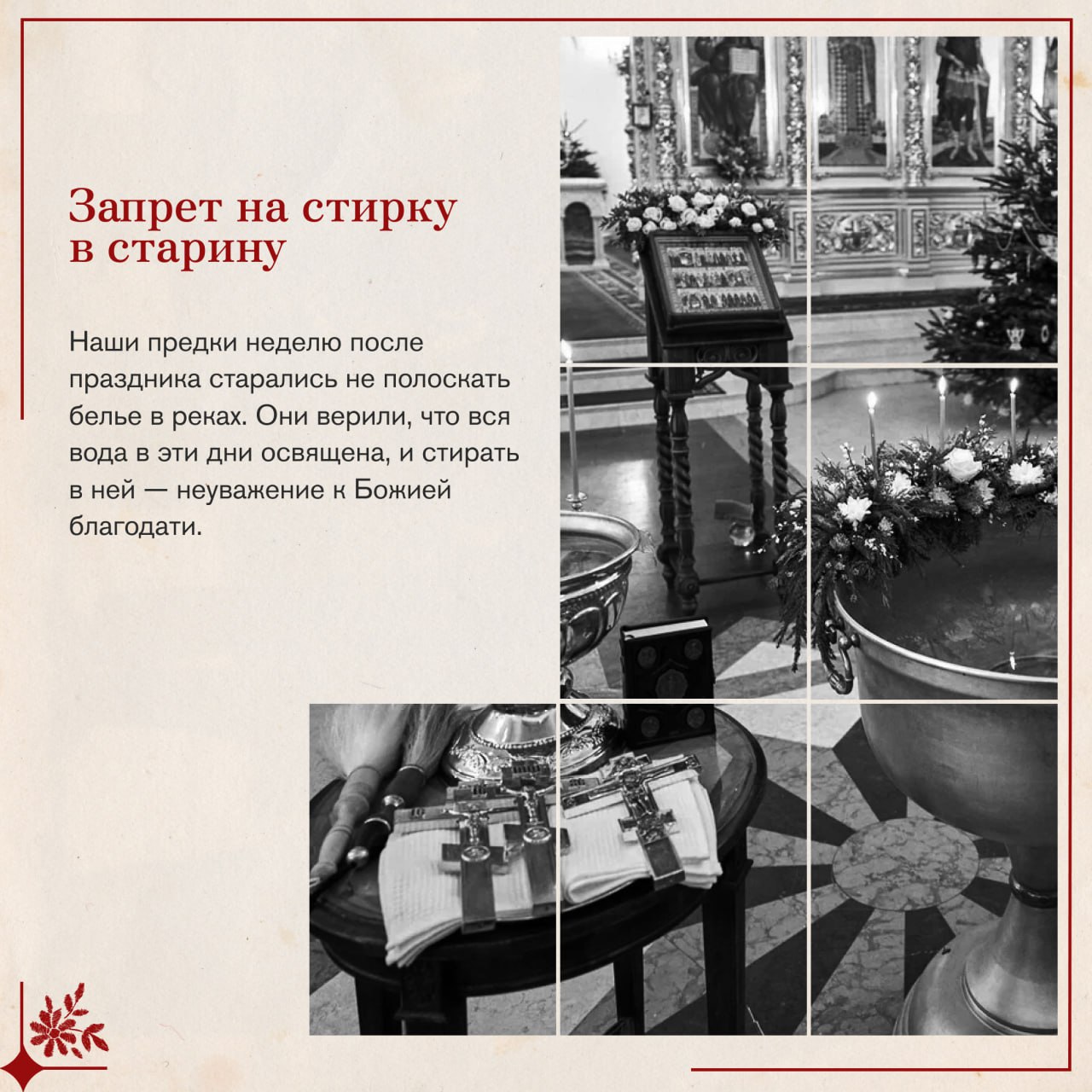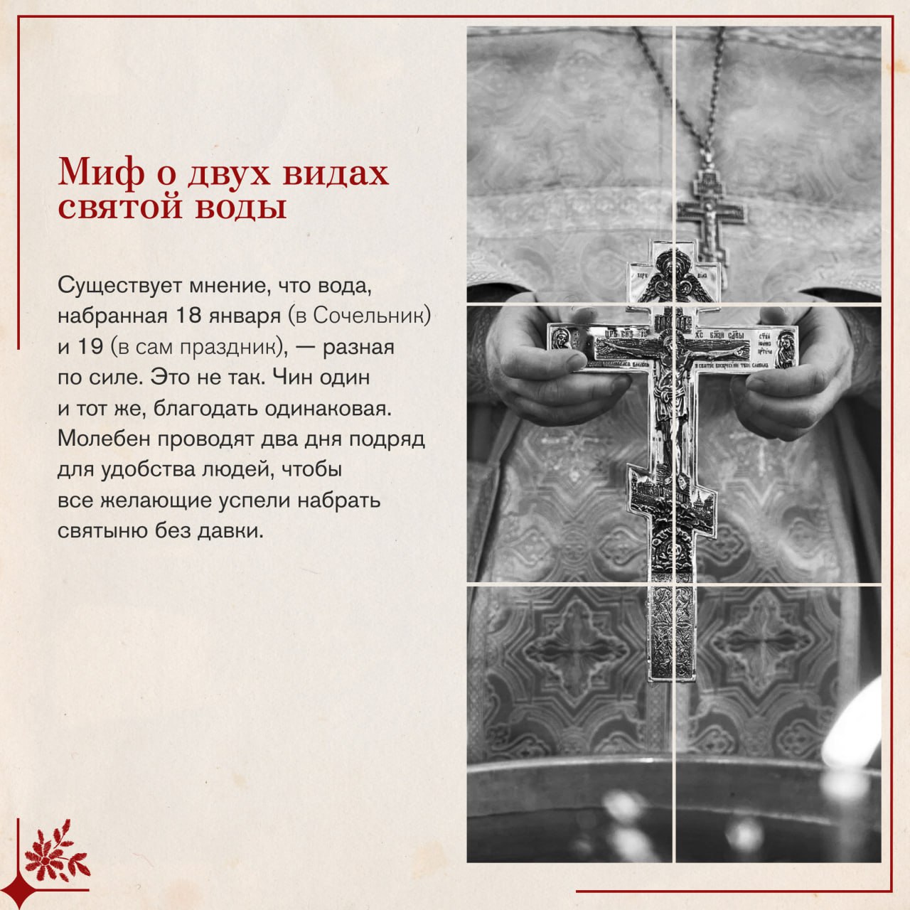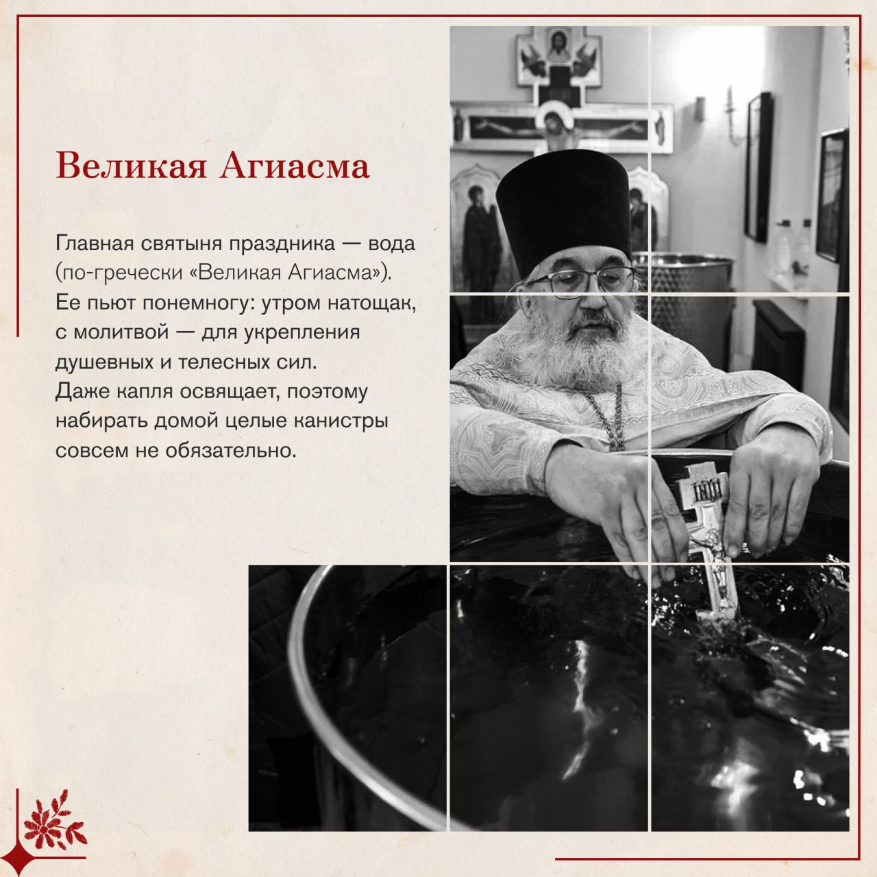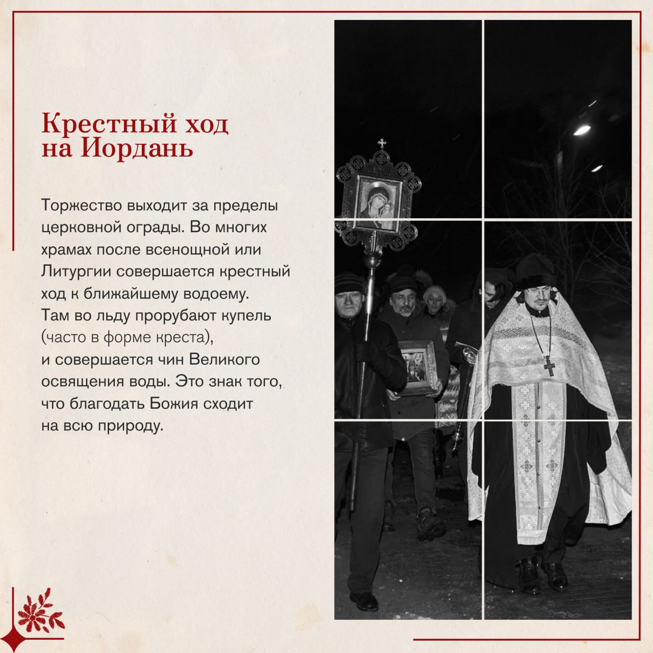В этот день вспоминают, как пророк Иоанн крестил народ в Иордане в знак покаяния. Христос тоже вошел в воду, хотя был абсолютно безгрешен. Он сделал это не чтобы очиститься Самому, а чтобы Своим погружением освятить водную стихию и всю материю мира.