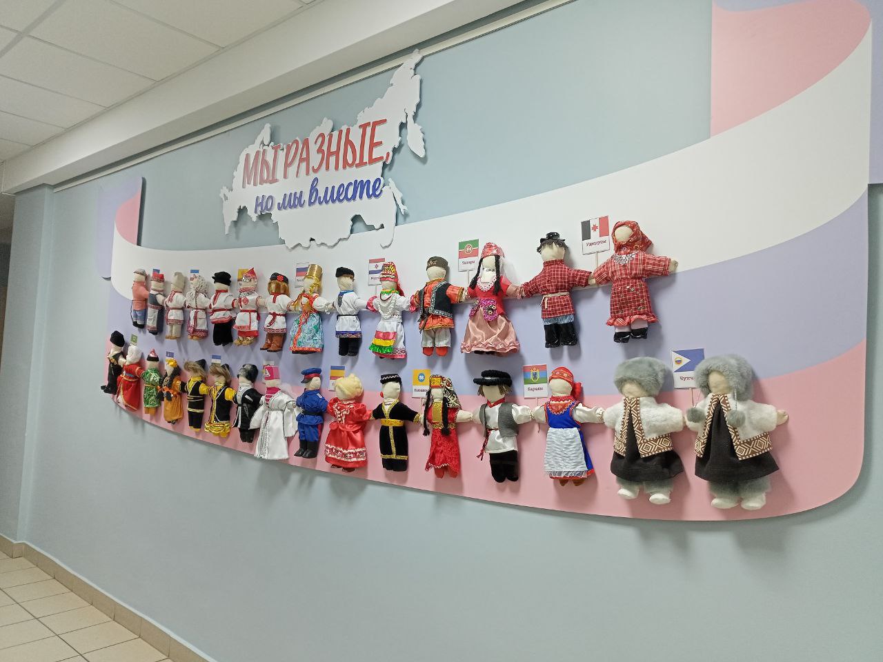 Большой дружный хоровод: 15 пар кукол в точных национальных костюмах представляют разные народы России — от башкир и бурят до татар, чувашей и русских. Они все вместе, взявшись за руки.