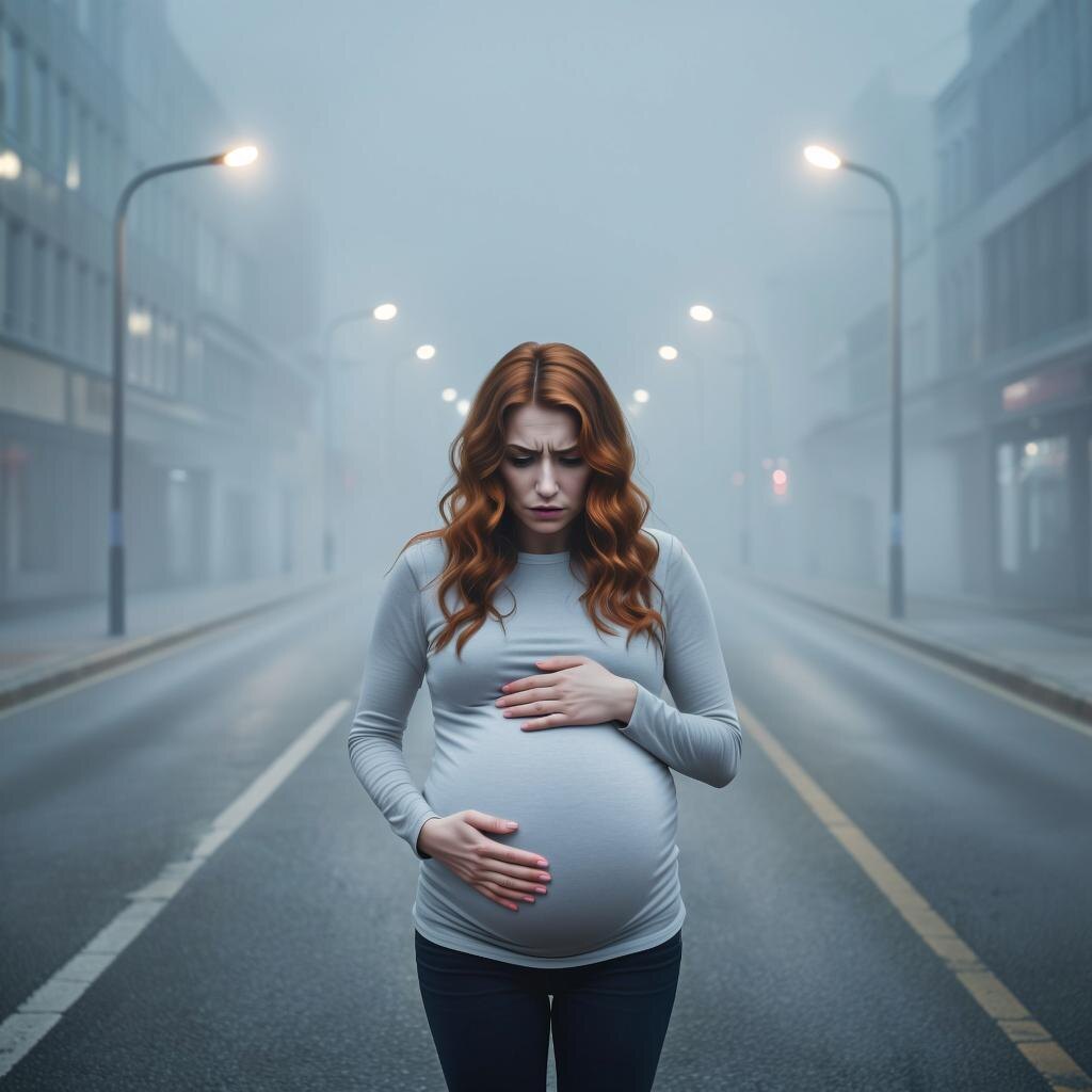 В центре заброшенной улицы, полон тревоги и ожидания, стоит человек с округлым животом, который кажется больше, чем есть на самом деле. Беспокойство переполняет его сердце, а туман вокруг создает атмосферу глубокой неуверенности.