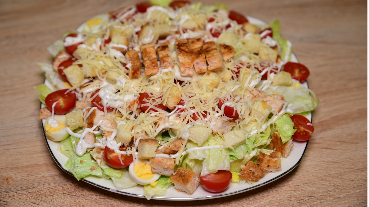 Собираем салат: цель — сохранить баланс между текстурами и нотами соуса. Сладкие помидоры черри, перепелиные яйца и куриная грудка образуют мясо?яичное ядро, а сухарики добавляют нужную хрустящую часть. Полив тонкой струйкой соуса завершает композицию.