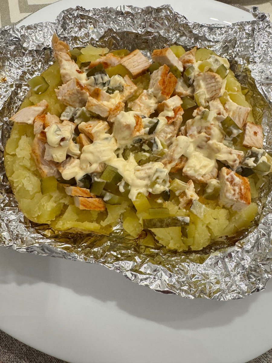 Этот рецепт предлагает сочетание запечённой картошки, нежной индейки и лёгкой заправки из греческого йогурта. Без жарки в масле, без сложных соусов, зато с ясной пользой и приятной текстурой.