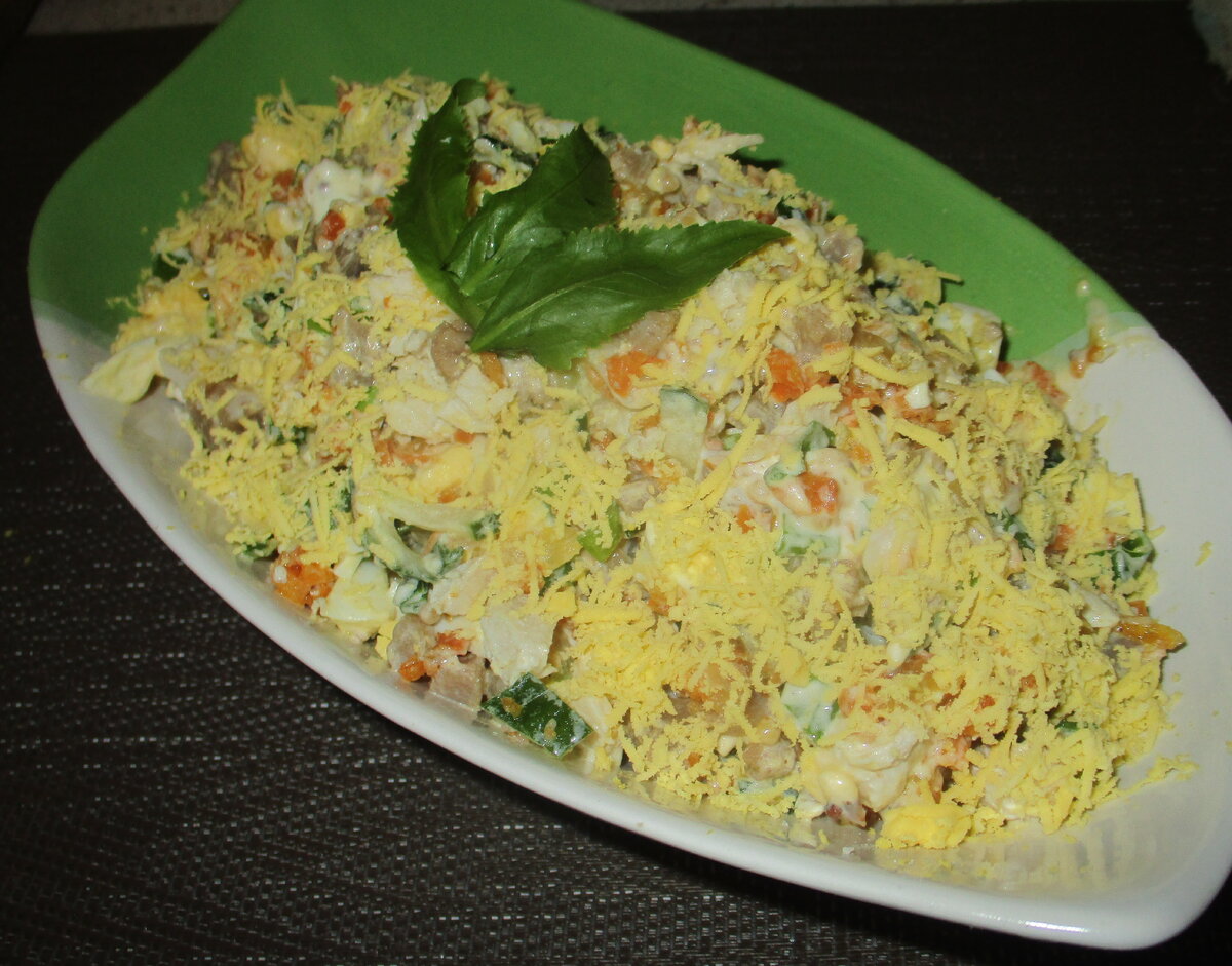 В процессе готовки важна простая последовательность: отварить курицу и яйца, обжарить лук с морковью, подготовить заправку и собрать ингредиенты в одну тарелку. Финальный штрих — легкая подача с зеленью и натертыми желтками, которая подчеркивает цветовую гамму и текстуру блюда.