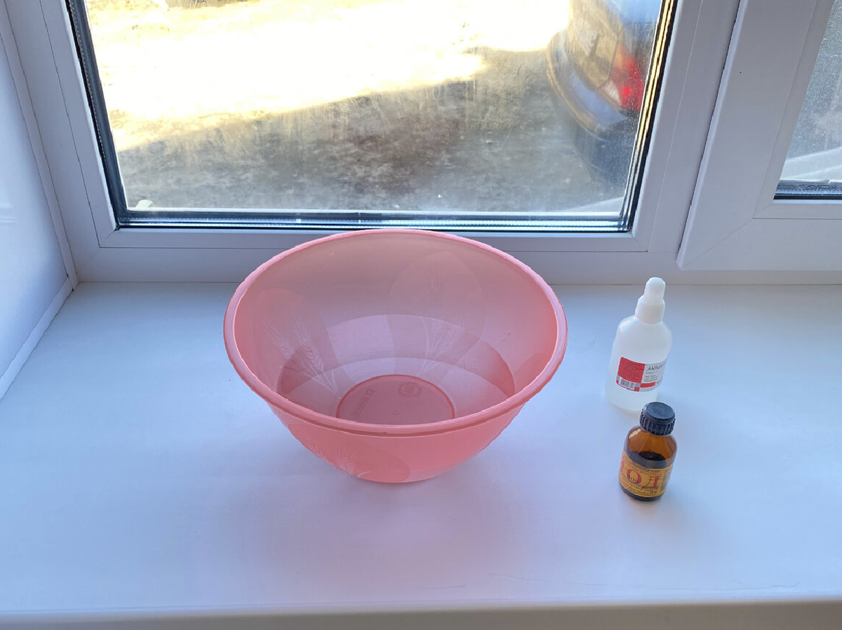 Для начала подготавливают раствор: литр тёплой воды, примерно половина чайной ложки йода и столовая ложка нашатырного спирта. Всё перемешивают до однородности.