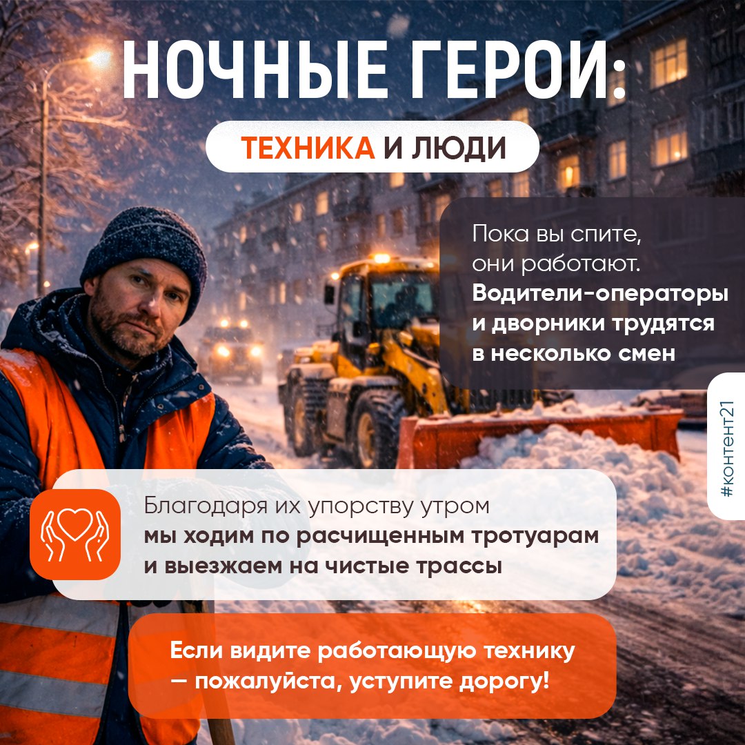 Пока мы пьём горячий чай, сотни дворников и единиц спецтехники трудятся в две смены, чтобы расчистить дороги, тротуары и дворы. Спасибо каждому, кто причастен к этой титанической работе!