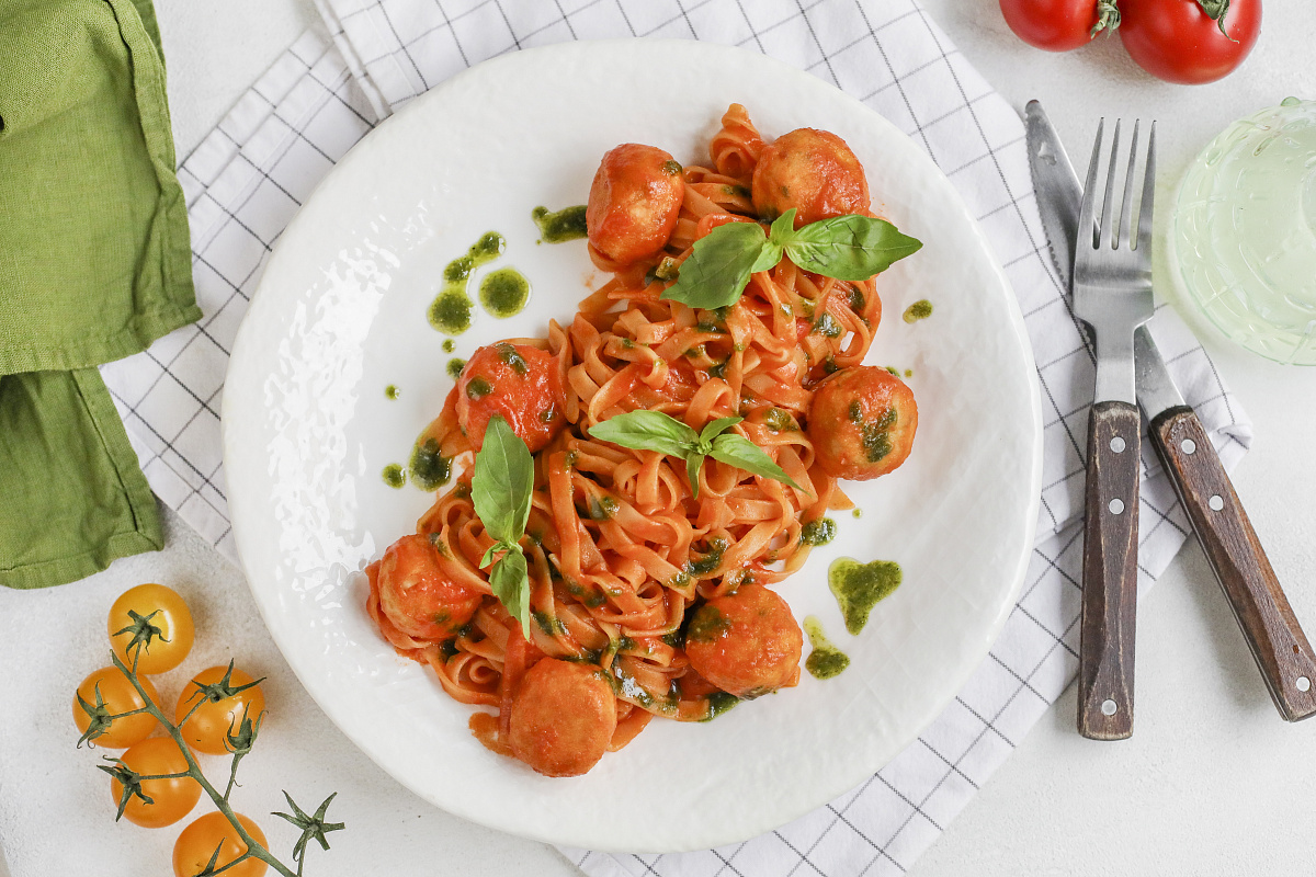 Начать можно с того, чтобы замочить кусочки батона в молоке, дав им впитаться в течение 5 минут.В это время лук нарезать на мелкие кусочки и обжарить на сковороде с растительным маслом в течение 2-3 минут, пока он не станет мягким.С помощью блендера переработать обжаренный лук с петрушкой до консистенции пюре.Хлеб отжать, чтобы избавиться от лишнего молока, затем соединить с фаршем, луковым пюре, добавить соль и перец, тщательно перемешать.Сформировать небольшие фрикадельки, обвалять их в панировочных сухарях и обжарить на сковороде до золотистой корочки.После этого на той же сковороде обжарить измельченный чеснок до появления аромата. Затем добавить протертые томаты и готовить 12 минуты, не забывая помешивать.Вернуть фрикадельки обратно в сковороду, накрыть крышкой и тушить 3-4 минуты.Параллельно в кипящей подсоленной воде отварить тальятелле около 3 минут, затем откинуть на дуршлаг.Соединить пасту с фрикадельками, добавить мелко нарезанный базилик и заправить соусом песто перед подачей.Приятного аппетита и успехов на кухне!
