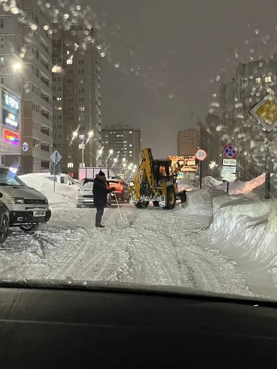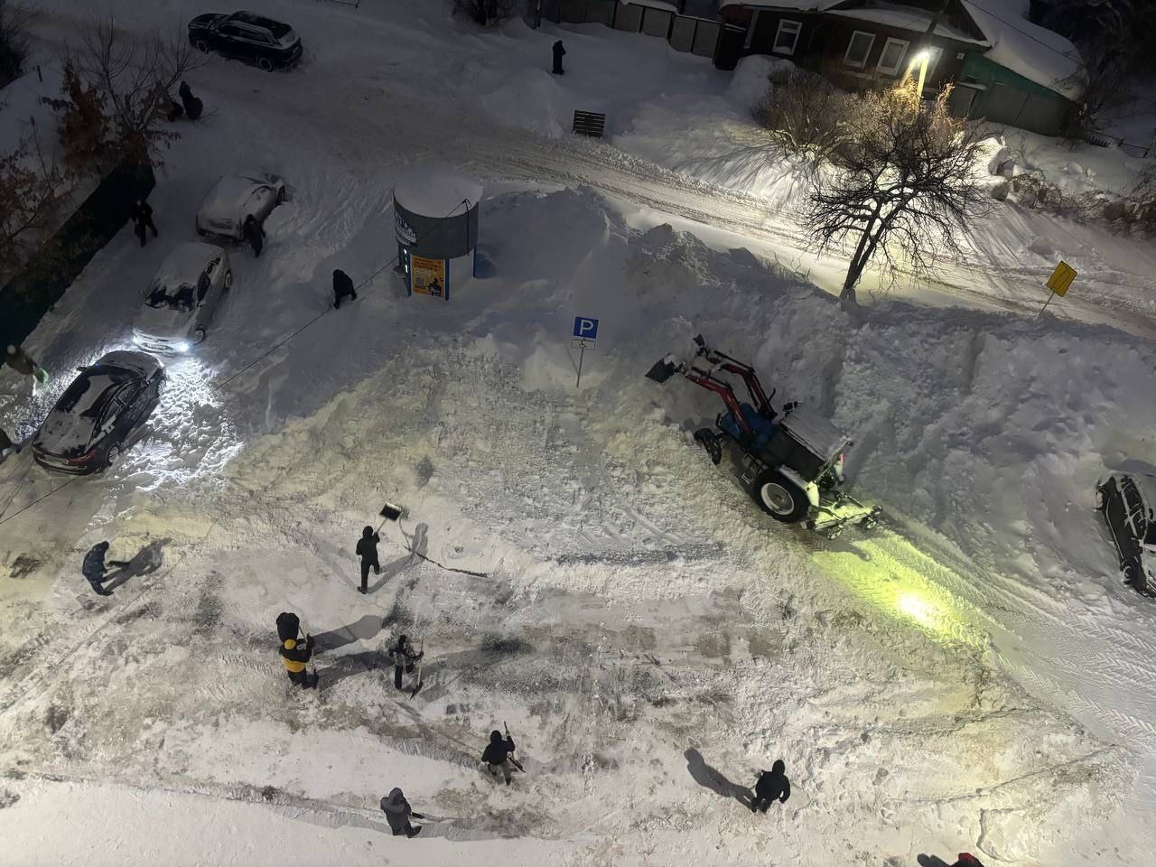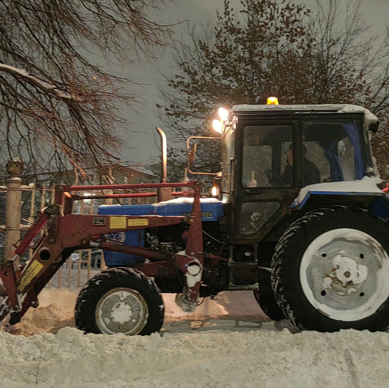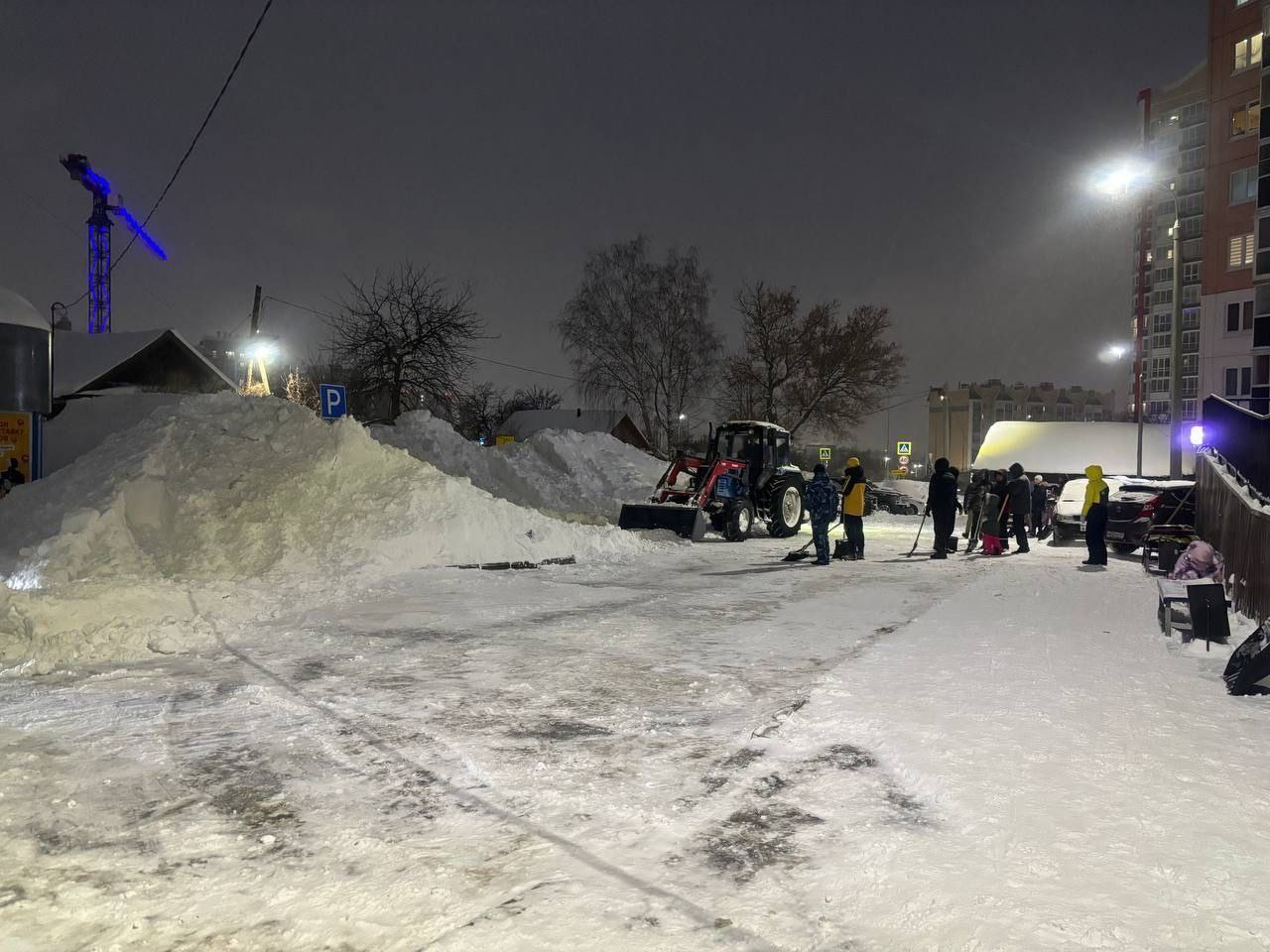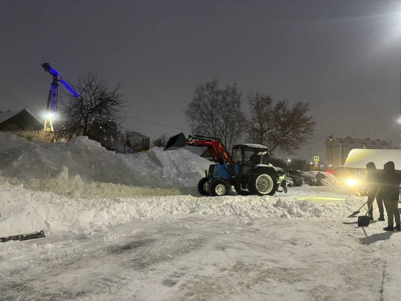 Несмотря на наступившую темноту, в Чебоксарах активно продолжается уборка территорий после сильного снегопада.