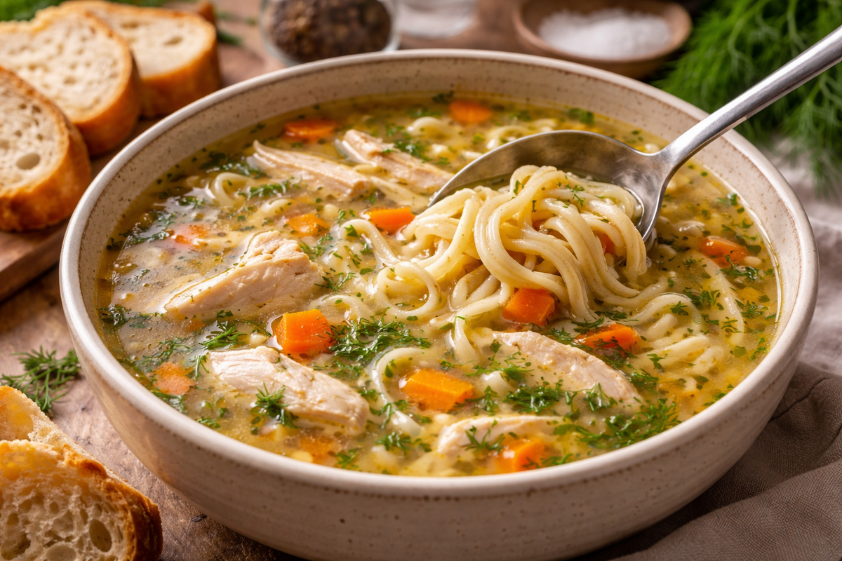 Сочетание ароматного бульона, нежного куриного мяса и тонкой лапши делает этот суп не просто блюдом, а настоящей семейной традицией.