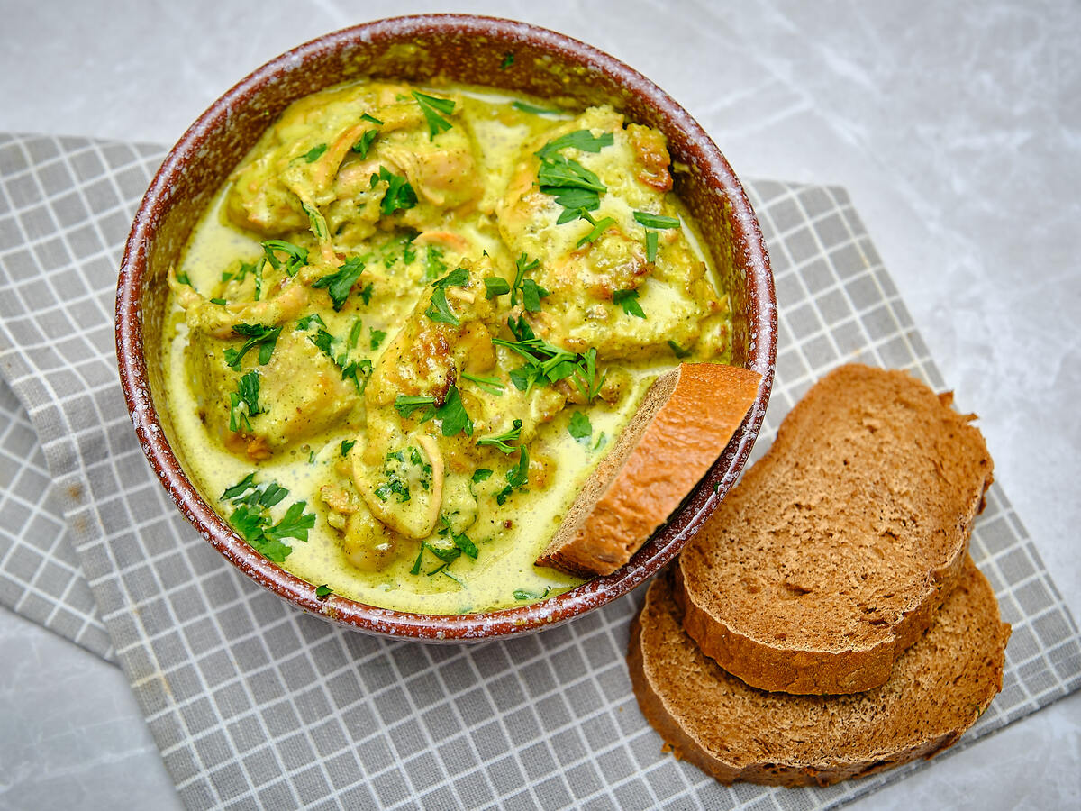 - Посыпать блюдо рубленой зеленью и подавать с хрустящим хлебом для макания в соус.