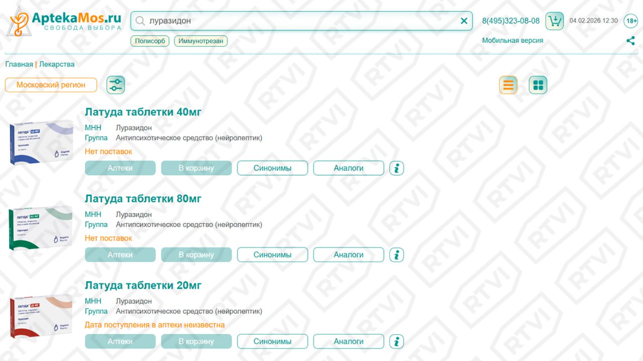 По данным агрегатора Apteka Mos, 4 февраля «Латуда» не была доступна ни в одной из аптек в 67 регионах, с которыми работает сайт. Нет лекарства и в онлайн-магазинах крупнейших федеральных аптечных сетей — «Ригла», «36,6», АСНА и других.
