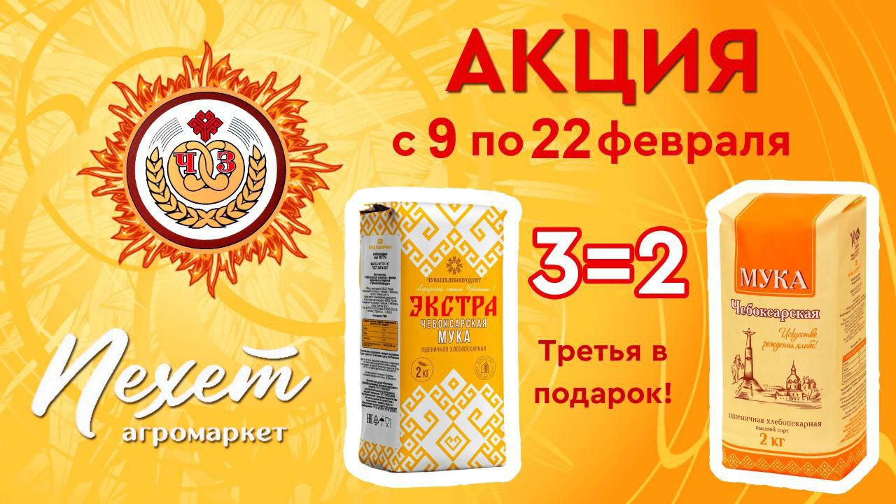 С 9 по 22 февраля в агромаркете Пехет пройдет акция, которая сделает вашу подготовку к празднику еще приятнее и выгоднее. Покупайте две пачки пшеничной муки «Чебоксарская» высшего сорта или сорта Экстра, и третью пачку вы получите в