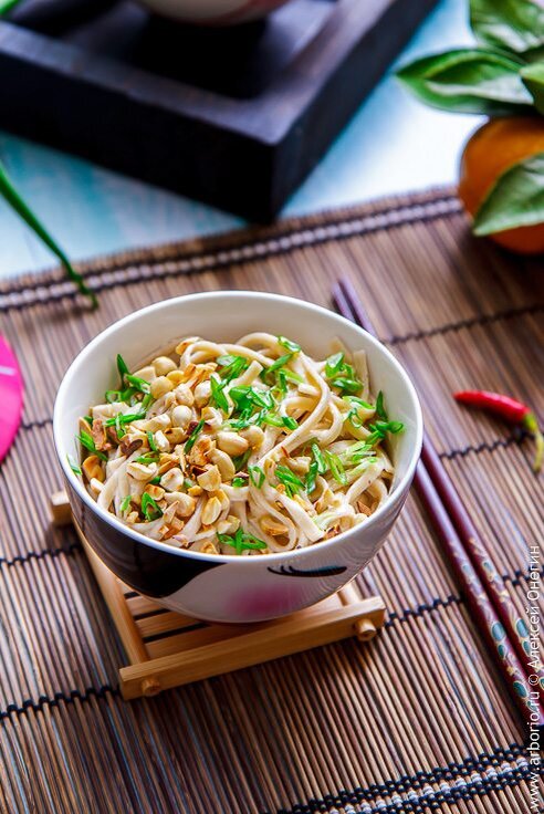 На сухой сковороде обжарить арахис до золотистого цвета, затем покрошить. В подсоленной воде отварить лапшу, тщательно помешивая до готовности. По завершении варки, слить воду и смешать лапшу с соусом, чтобы каждая ниточка покрылася ароматной смесью. Подача также включает посыпку лапши арахисом и зелёным луком, а для усиления аромата можно добавить несколько капель кунжутного масла, пишет канал "Алексей Онегин ? Кулинарный исследователь".
