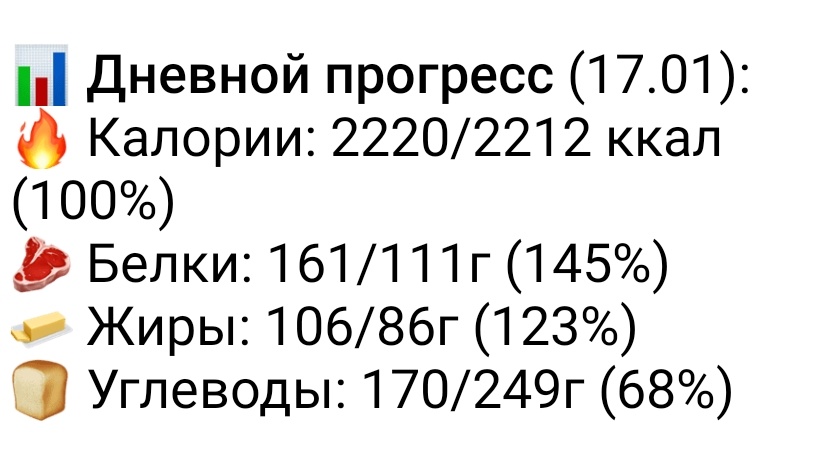 Вес остаётся в зоне удачного контроля: конкретные цифры меняются не так быстро, но устойчивость сохраняется. Важно ощущать себя бодрым на тренировках, поддерживать режим и позволять себе небольшие корректировки рациона в зависимости от силовых нагрузок и общей активности.