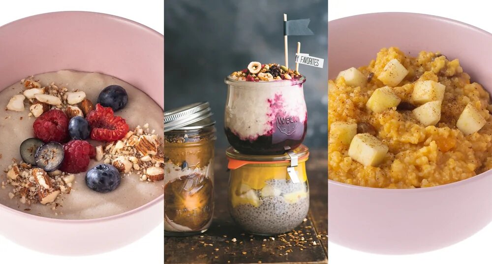 Третий вариант на растительном молоке. Можно соединять крупу с молоком той же основы (гречка с гречневым молоком, овсянка с овсяным), либо экспериментировать с контрастами, например овсянку с кокосовым молоком. Важно засыпать крупу на воде, а утром довести до нужной консистенции растительным молоком.
