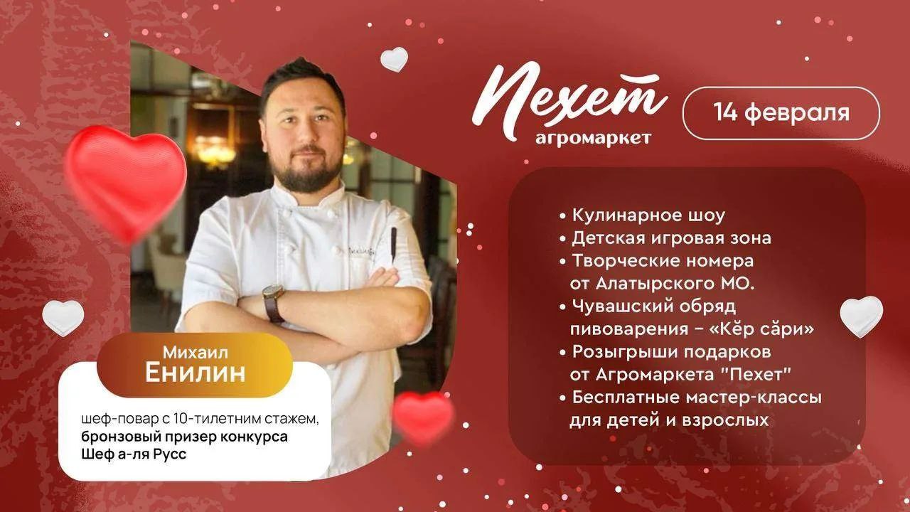 14 февраля в агромаркете «Пехет» пройдет мастер-класс от шеф-повара Михаила Енилина, который поделится секретами мастерства и научит готовить изысканные блюда.