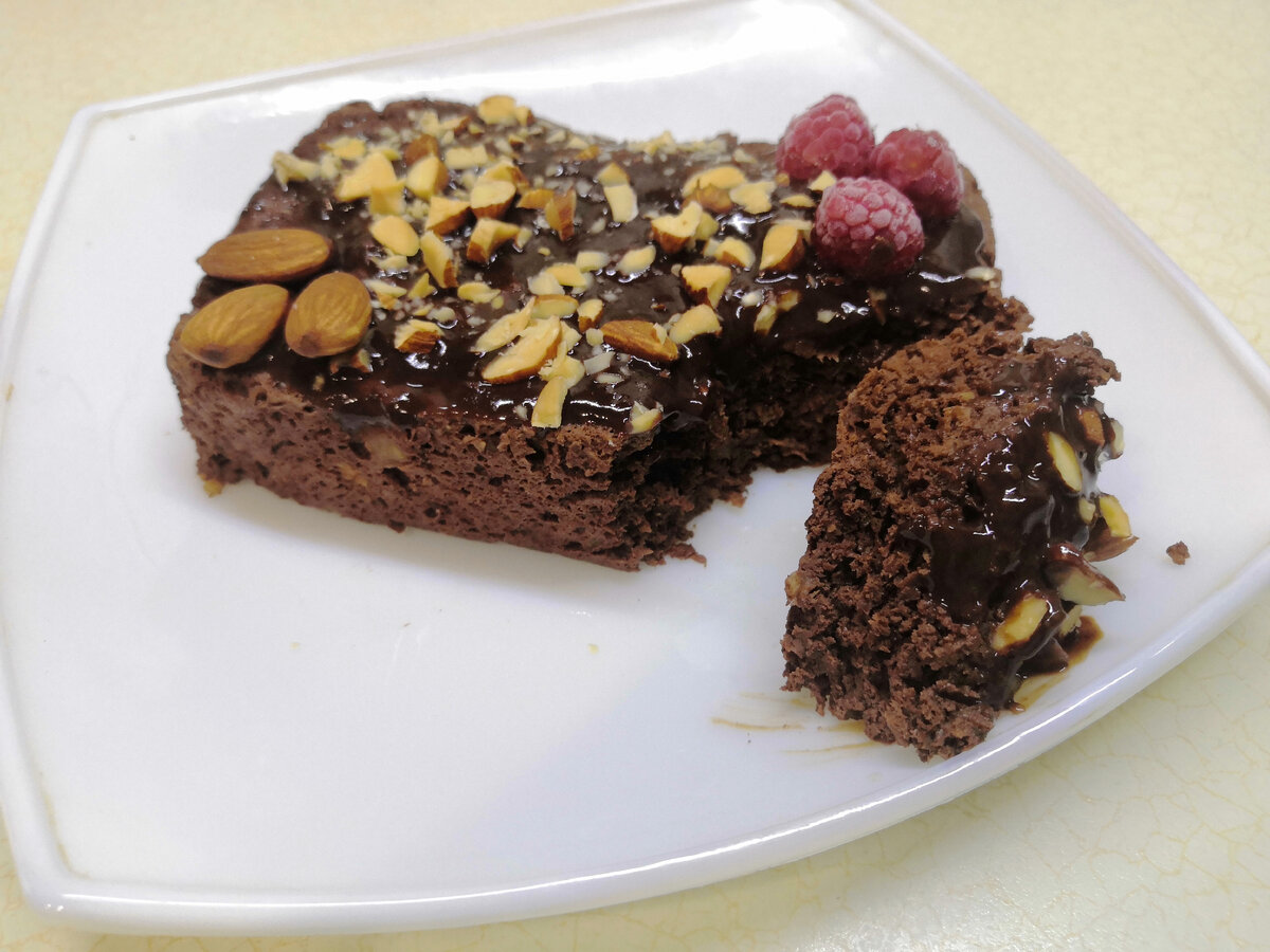 3. Выпекание и глазурь: Полученную массу выложить в подходящую форму и запекать в микроволновке в течение 4 минут (при мощности 700 Вт). Для глазури темный шоколад растопить вместе с молоком в микроволновке (не доводя до кипения) и перемешать до однородности. Готовую глазурь равномерно распределить по кексу, украшая по желанию орехами и малиной.