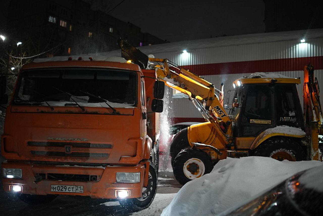 Ночная смена по уборке снега на дорогах Чебоксар