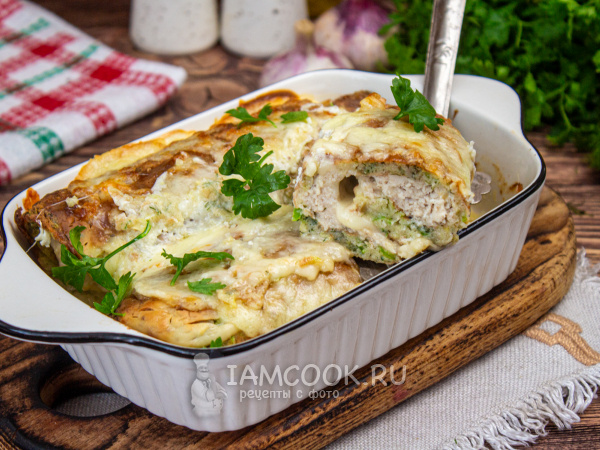 5. Запекайте. Сверните каждый блин в рулет и уложите в форму для запекания. Смажьте подготовленным соусом из сметаны, чеснока и специй, затем запекайте в духовке при 180°С в течение 40-45 минут. За пять минут до окончания готовки присыпьте тертым сыром и дождитесь его расплавления.