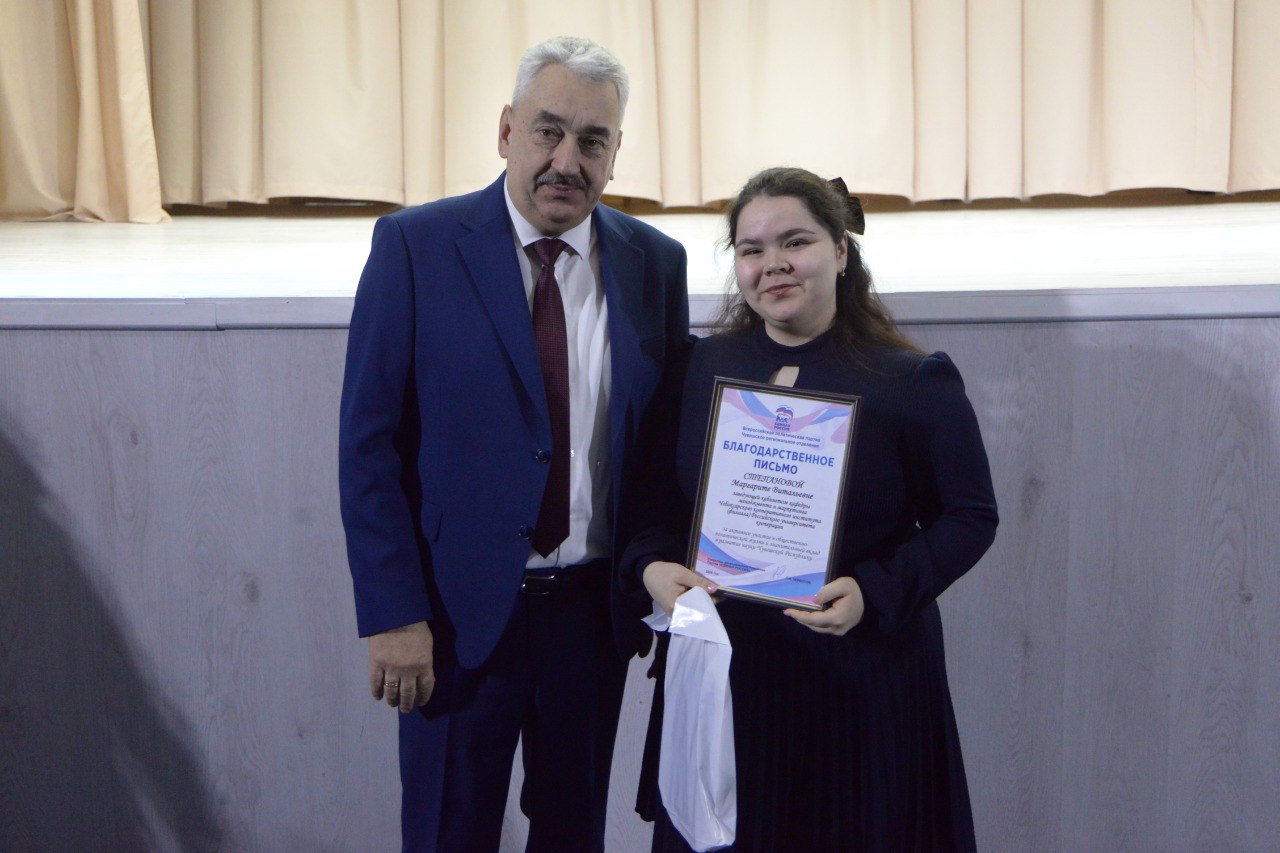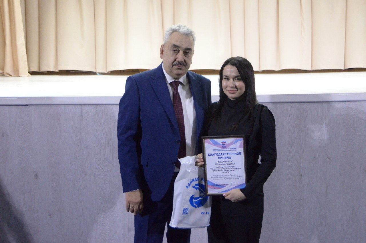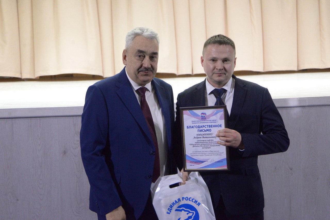 Вручил Благодарственные письма партии «Единая Россия» сотрудникам вуза, отличившимся в общественно-политической жизни и внесшим значительный вклад в развитие науки Чувашской Республики.