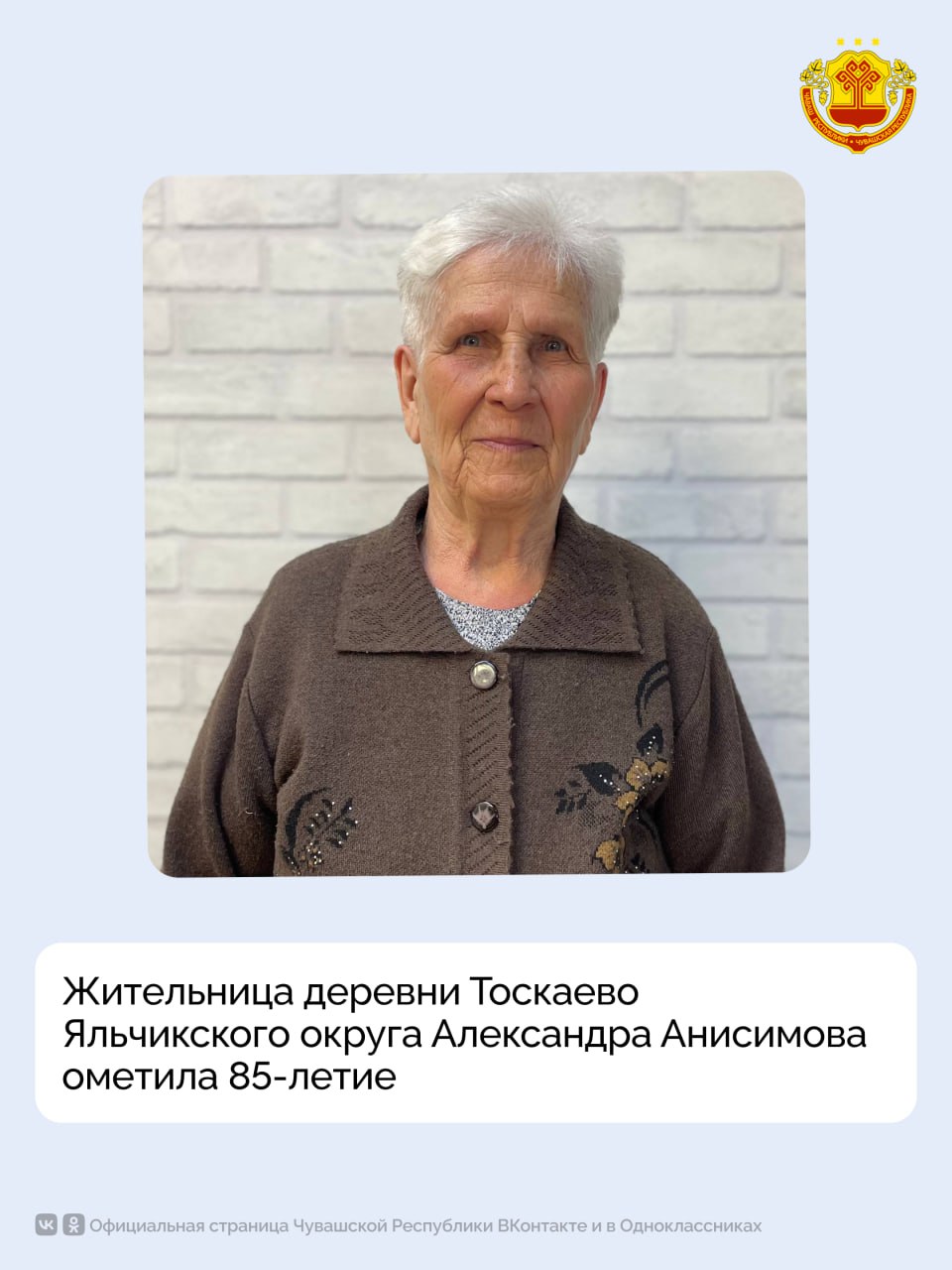 85-летний юбилей отпраздновала жительница деревни Тоскаево Яльчикского округа Александра Анисимова.