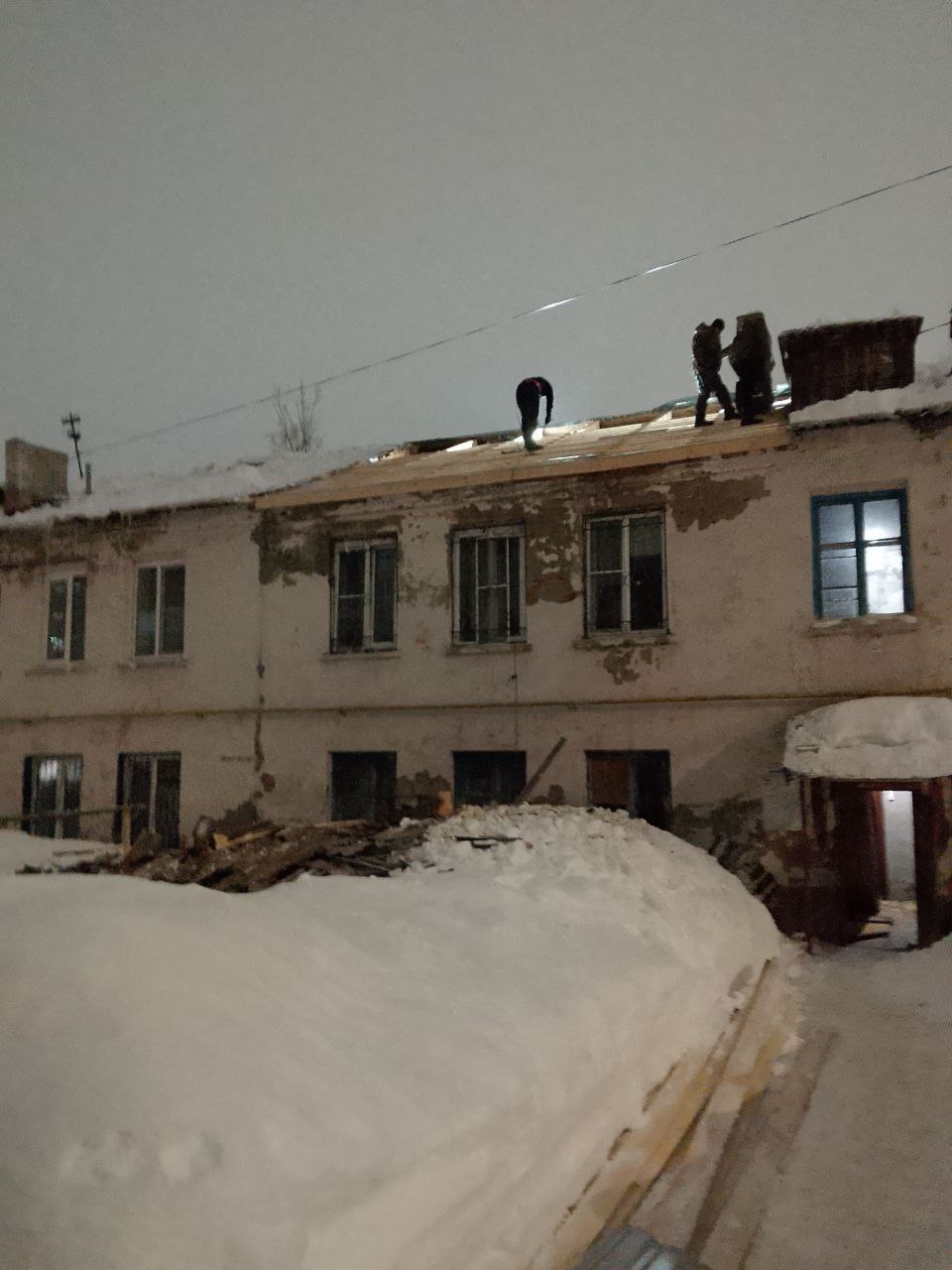 Рабочие заменили шесть стропил кровли дома №12 по улице Силикатная, заканчивают обрешетку, временно закроют пленкой, а завтра установят металл и завершат работы. Отопление уже подключено.