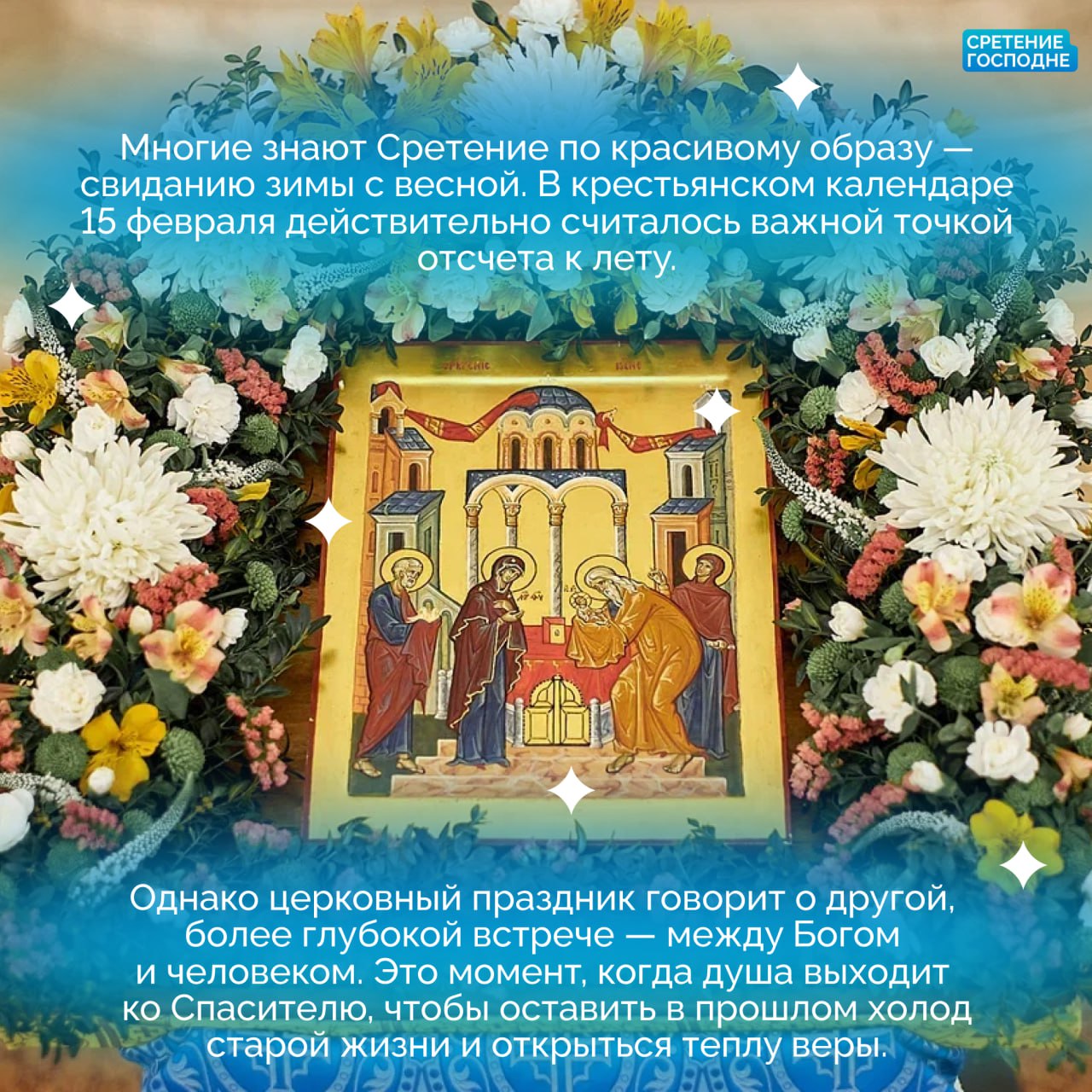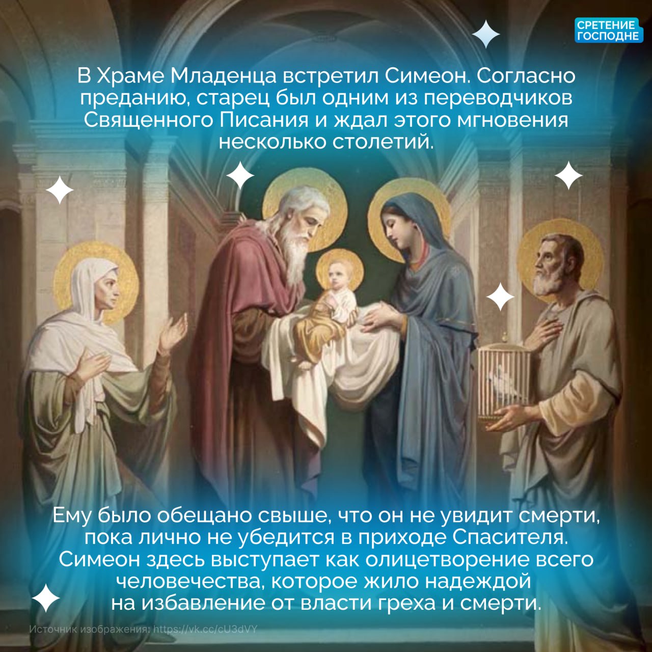 В карточках рассказали, как древнее пророчество исполнилось в руках старца Симеона, и какой смысл этот день несет для каждого из нас.