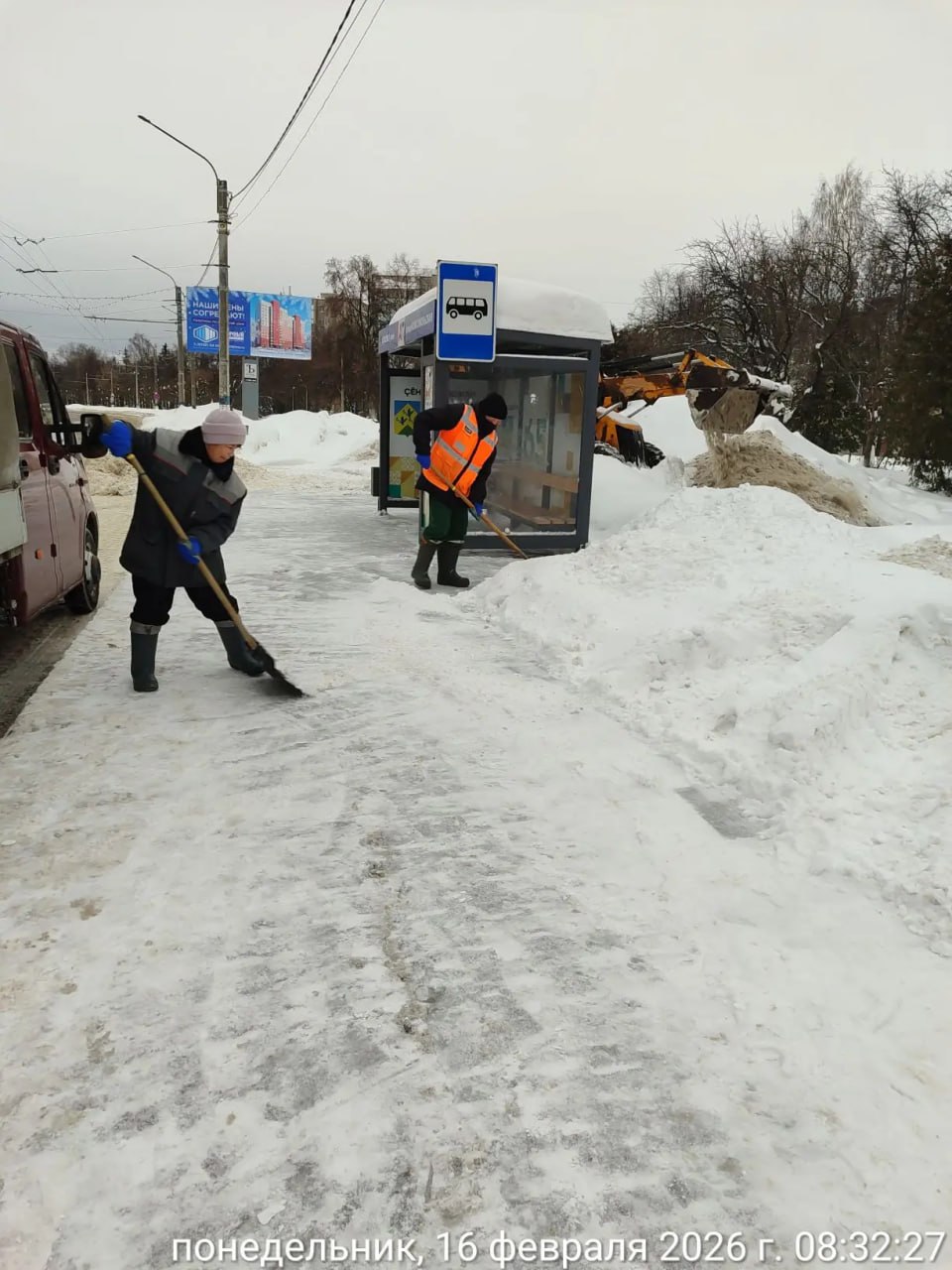 В ночную смену дороги очищали 4 комбинированные дорожные машины, трактор со щёткой, 3 экскаватора-погрузчика. В дневную смену работают 4 КДМ, 2 ротора, 4 экскаватора-погрузчика, МТЗ-щётка и дорожные рабочие.