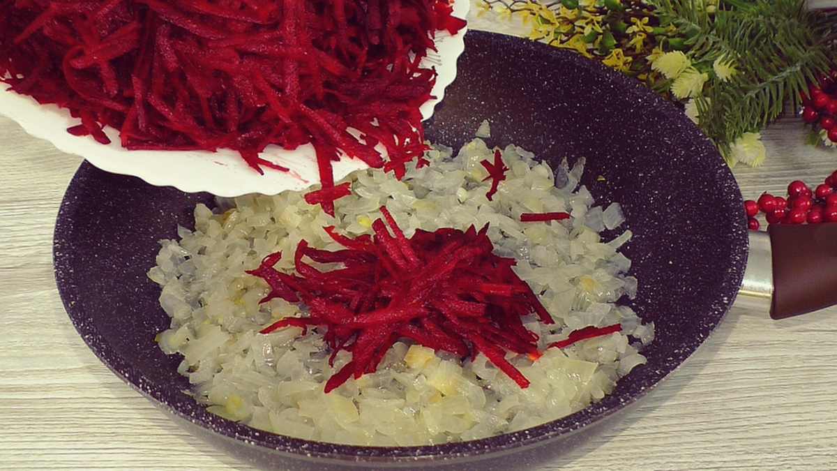 Свёклу и морковь натереть на крупной тёрке и добавить к обжаренному луку.